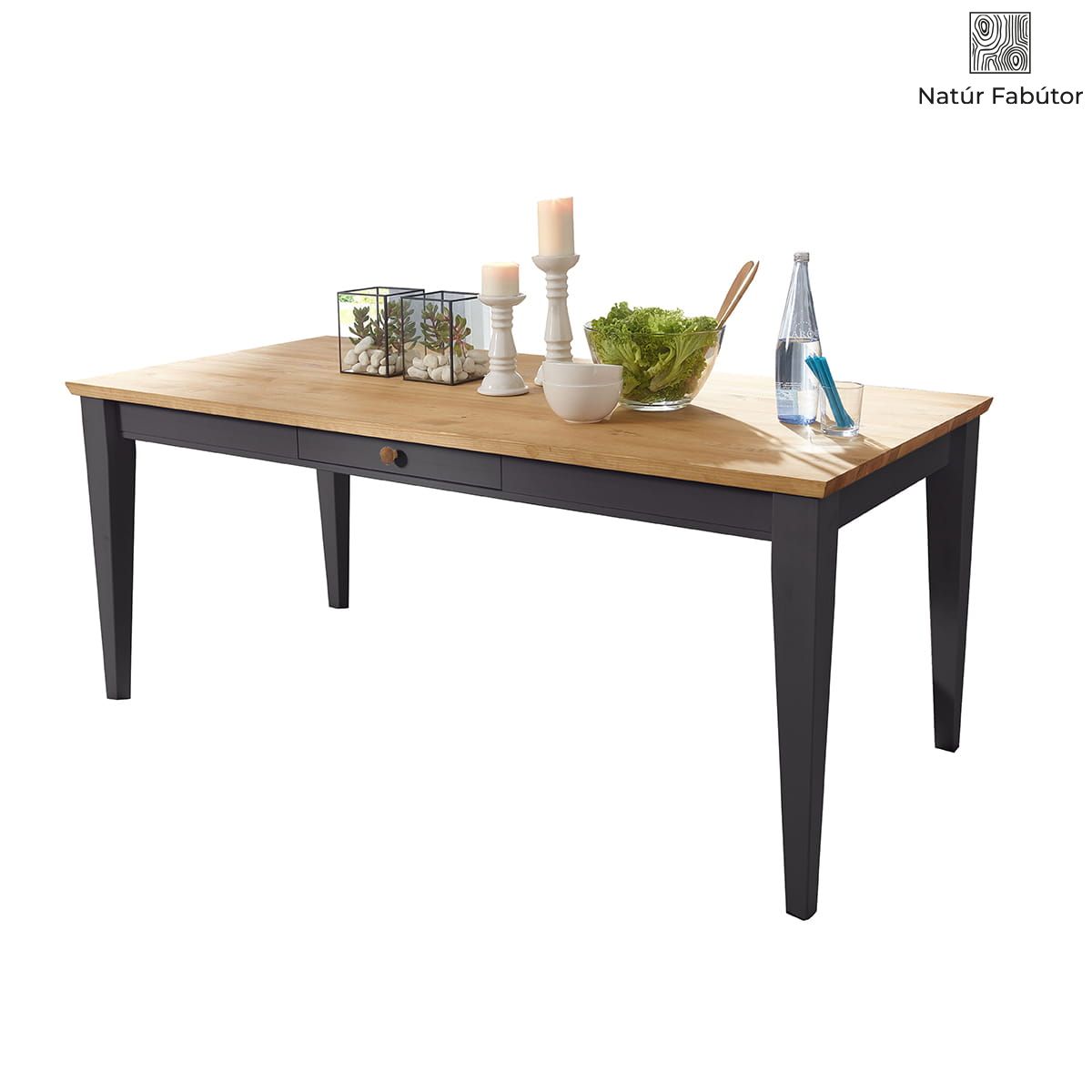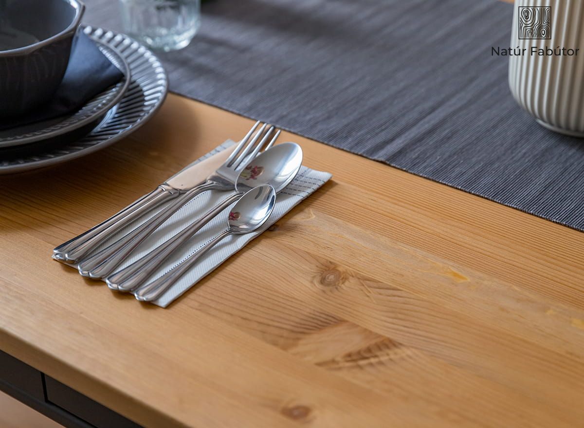 A természetes fa színű asztallapot vízbázisú páccal kezeltük, amely kiemeli és hangsúlyozza a fenyőfa előnyeit, ami tökéletesen harmonizál a bútor többi grafit színű elemével. Az asztal továbbá egy kis fiókkal van felszerelve, amely további tárolóhelyet biztosít, és lehetővé teszi Önnek, hogy rendet tartson az asztalon. A fiók kerek fa fogantyúval van ellátva, amely színében összhangban van az asztallappal. A gyártás minden szakaszában ügyeltünk a legapróbb részletekre is – a megbízható és ellenőrzött fa forrásától kezdve az ökológiai lakkok és festékek kiválasztásáig, amelyek nem ártalmasak az Ön egészségére.