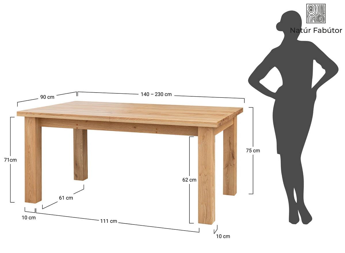 Az ajánlatunkban szereplő 140 cm hosszú és 230 cm-re hosszabbító asztalt kiváló minőség jellemzi. A lapja fából készült, akárcsak a bútordarab összes többi eleme, és 2 cm vastag, akárcsak az ugyanilyen vastag lábazat. Ezt egészíti ki a 11 cm széles lábazat. Az asztal a "pillangó" rendszer segítségével bővíthető az asztal közepében található 90 cm széles bővítménnyel, amelyet az asztal széthúzása után lehet kifordítani és beilleszteni. A rendszert könnyű kezelhetőség és hosszú távú tartósság jellemzi.