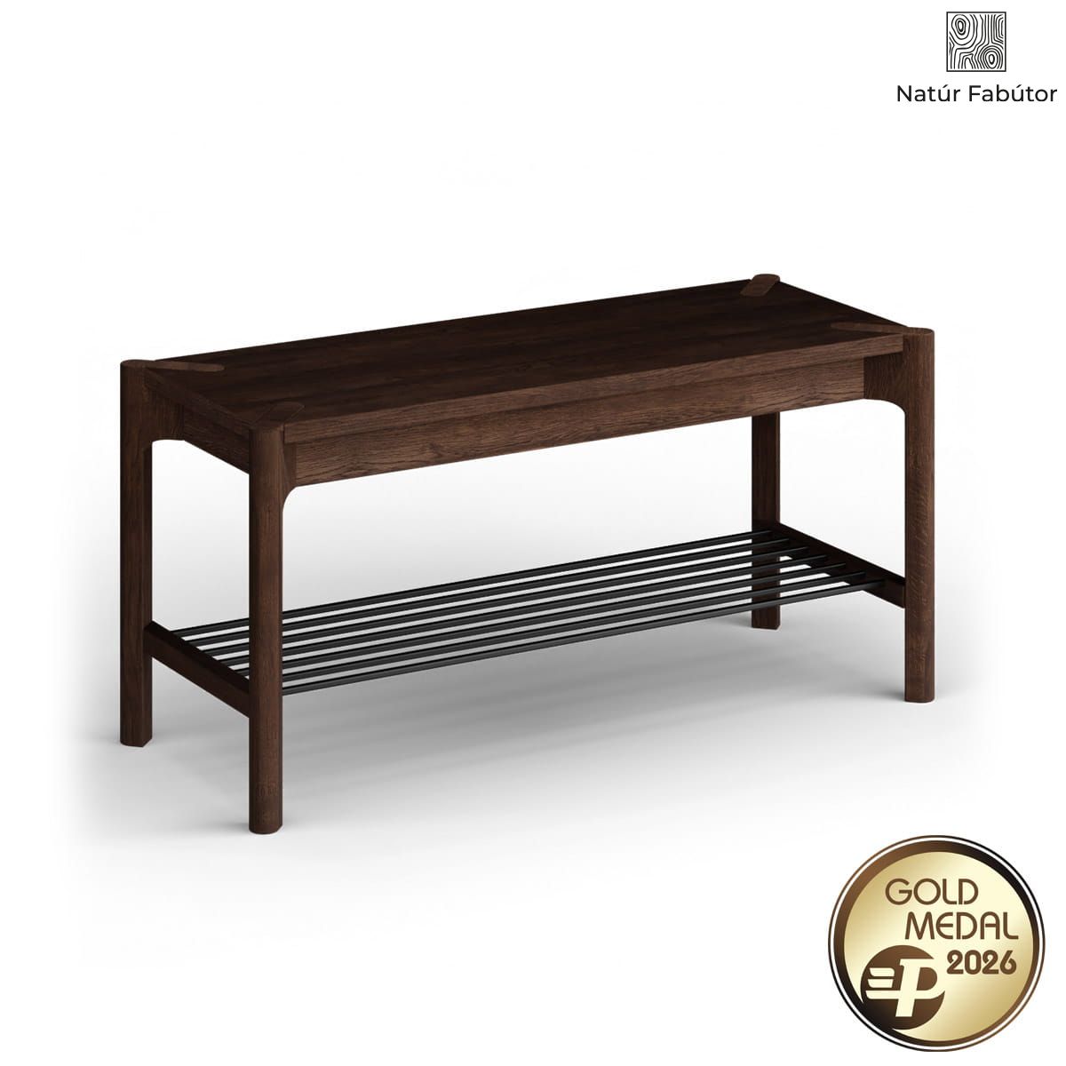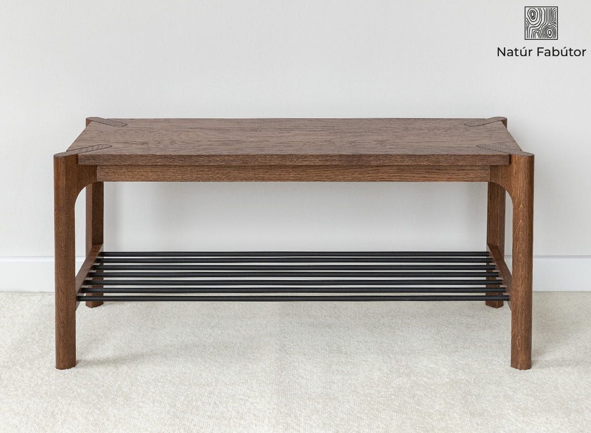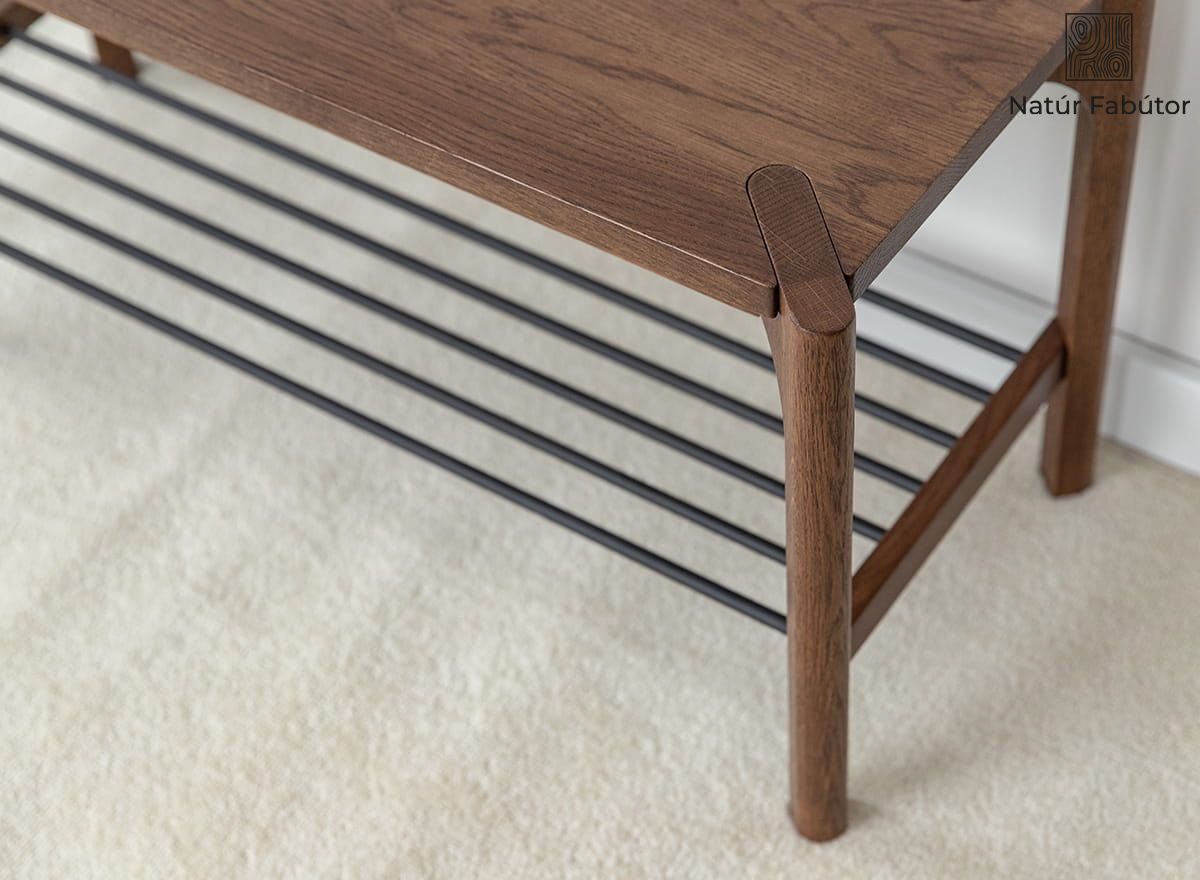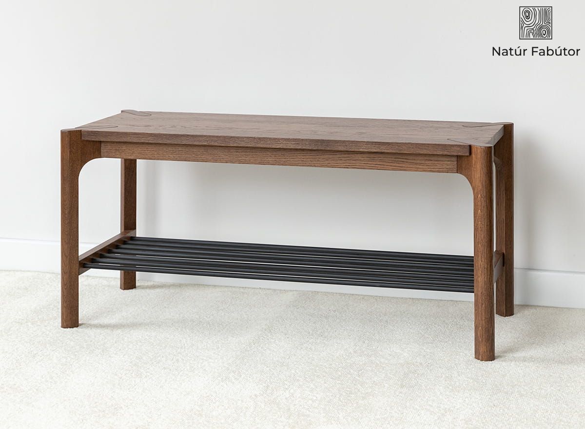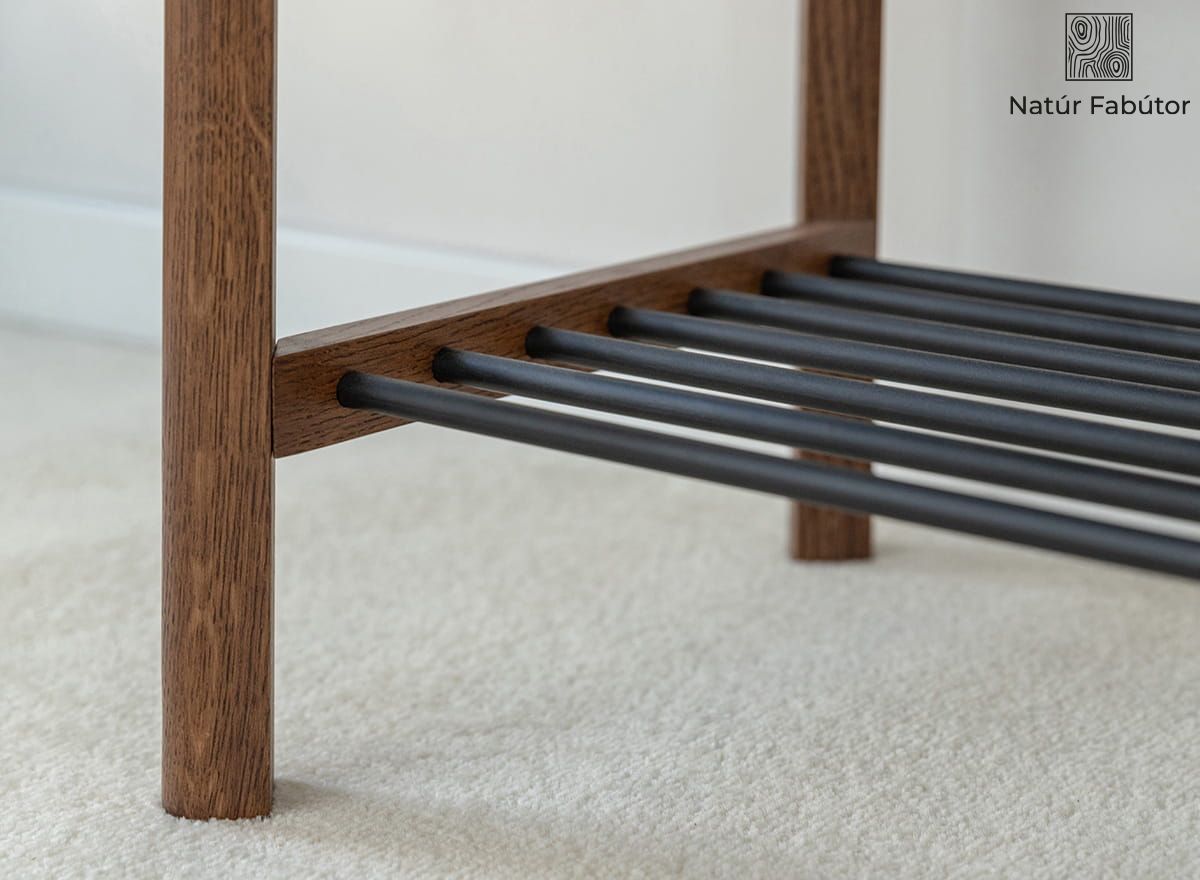 A kétszintes kialakítás – felső, tömörfa polc és alsó, fém rudakból álló rács – teljes körű, mindennapokban is hasznos megoldást kínál. A felső pult ülőfelületként vagy táska-, illetve kulcstartóként is funkcionálhat, míg az alsó szintre több pár cipő kényelmesen elhelyezhető, és a nyitott szerkezetnek köszönhetően jól szellőzik. Ez a polc sokoldalú és helytakarékos – ideális keskeny előszobákba, de remekül használható gardróbban is.