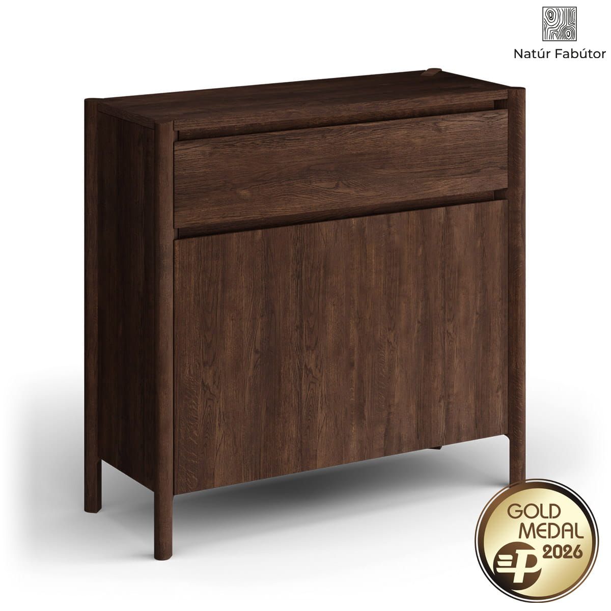 A Campi kollekció cipősszekrénye tömör tölgyfából készült – ez a fa híres rendkívüli tartósságáról és kopásállóságáról. A felületet Borma olajjal olajoztuk, amely védi a fát, miközben félmatt, elegáns megjelenést kölcsönöz neki. A kezelésnek köszönhetően a felület keményebb és ellenállóbb lett, így gond nélkül bírja a mindennapos, intenzív használatot is. Az alsó, lehajtható ajtók precízen kidolgozottak, és kényelmes hozzáférést biztosítanak a cipőkhöz – nem kell többé a család cipői között keresgélni. A csendes záródású fiók teljesen hangtalanul nyílik és záródik, ez pedig azok közé az apró részletek közé tartozik, amelyek a mindennapi kényelmet valóban érezhetővé teszik.