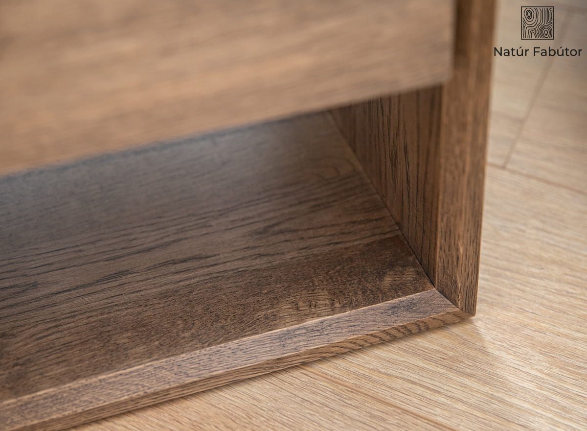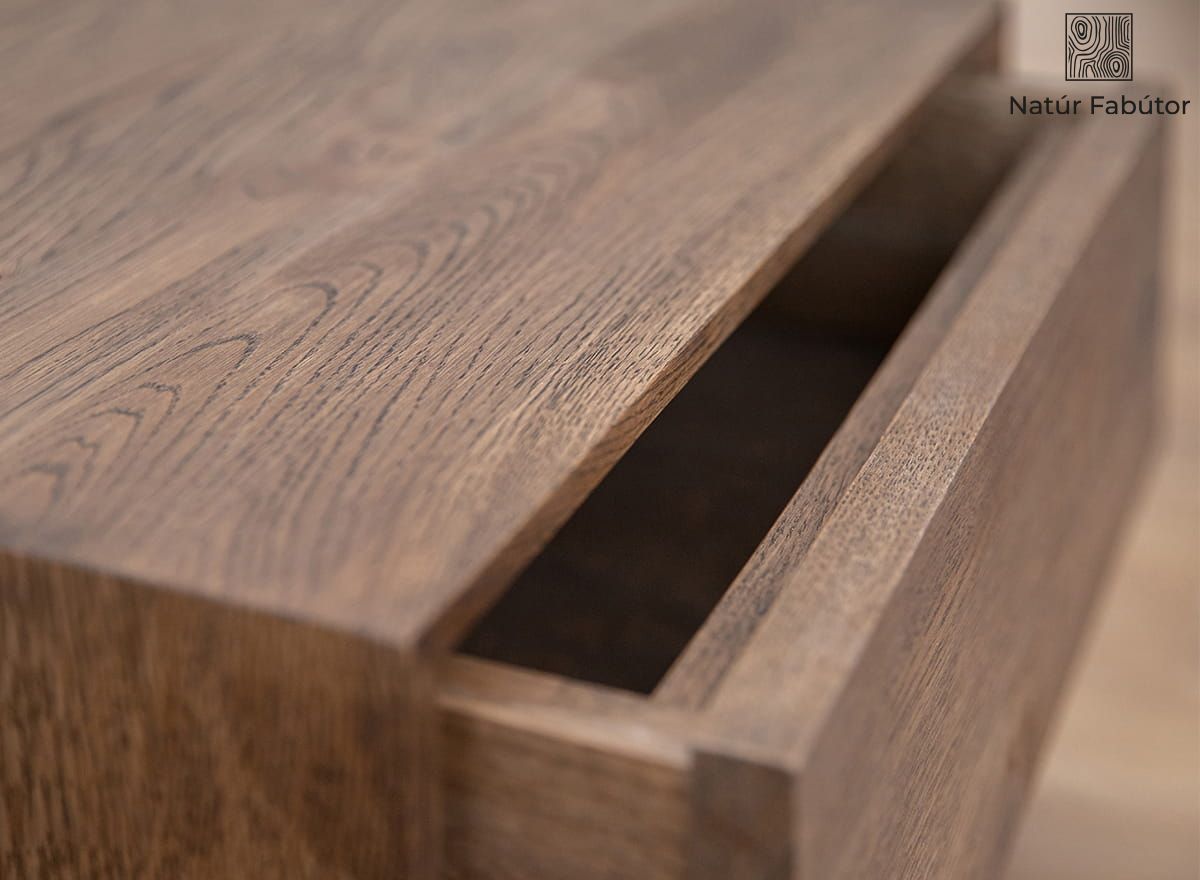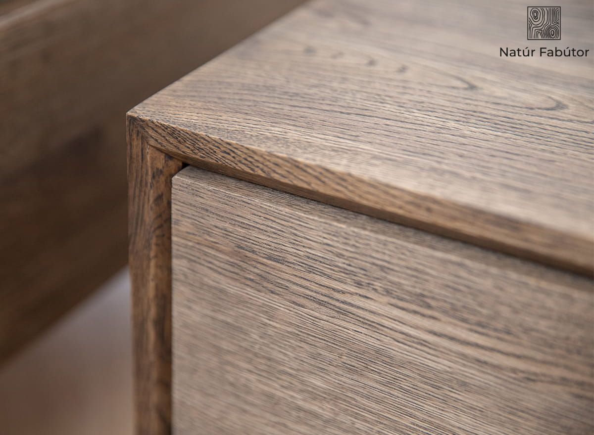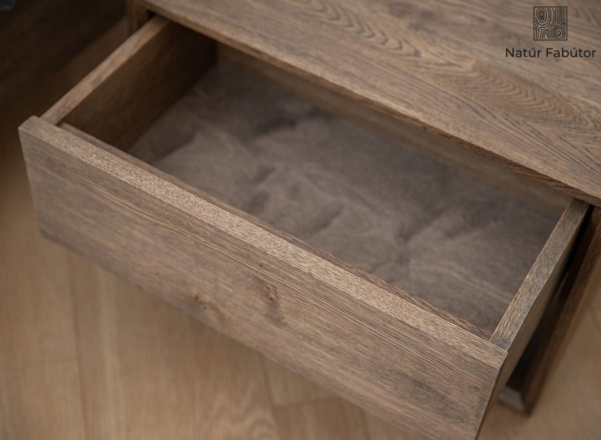 A bemutatott fából készült éjjeliszekrény nemcsak vizuálisan vonzó, hanem kiválóan kivitelezett is - akárcsak az Adria kollekció többi bútora. Az egész szekrény tölgyfából készült - egy természetes, a kiváló minőség kedvelőinek kedvenc alapanyagából, nagyon nagy ellenállóképessége és évtizedekben számolt tartóssága miatt. A szekrényt füstölt felületkezeléssel láttuk el - ez egyike azon kevés felületkezelésnek, amely a vásárlást követően hosszú éveken át vonzó megjelenést biztosít.