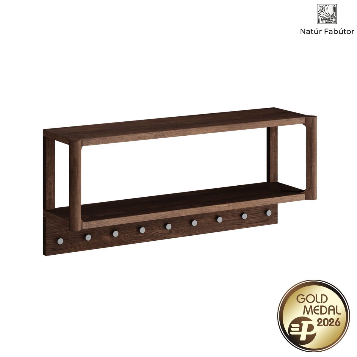 A Campi kollekció tölgyfa fogasa nem csupán dekoratív kiegészítő, hanem átgondolt, időtálló konstrukció. Készült tömör tölgyfából, amelyet Borma olajjal olajoztak, így felülete ellenáll a karcolásoknak, nedvességnek és intenzív használatnak. A tíz, egyenletesen elhelyezett fa akasztó rengeteg helyet kínál kabátok, táskák, gyerek hátizsákok, sálak vagy akár nedves esernyők számára. A felső polc pedig egy extra rendszerezési zóna – ide teheti a dísztárgyakat, kosarakat, könyvet vagy akár bukósisakot. Mindez anélkül, hogy a bútor nehézkesnek hatna – a forma arányai és nyitottsága megőrzi a tér levegősségét.