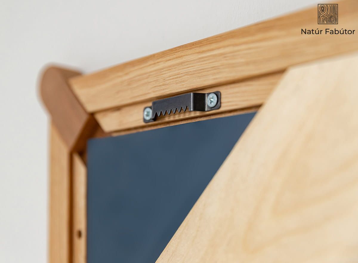 A keret tömör tölgyfából készült, amelynek erezete egyedi és minden darabnál másként rajzolódik ki. A félmatt Borma olajos felületkezelés lehetővé teszi, hogy a fa lélegezzen, ugyanakkor megvédi azt a nedvességtől és a mindennapi használat során keletkező sérülésektől. A szerkezet kompakt és masszív, ami – mérete ellenére – megbízhatóságot és tartósságot sugall. A finoman lekerekített élek és sarkok nem csupán esztétikai elemek: az ergonómiára és a biztonságra fordított figyelemről is tanúskodnak.