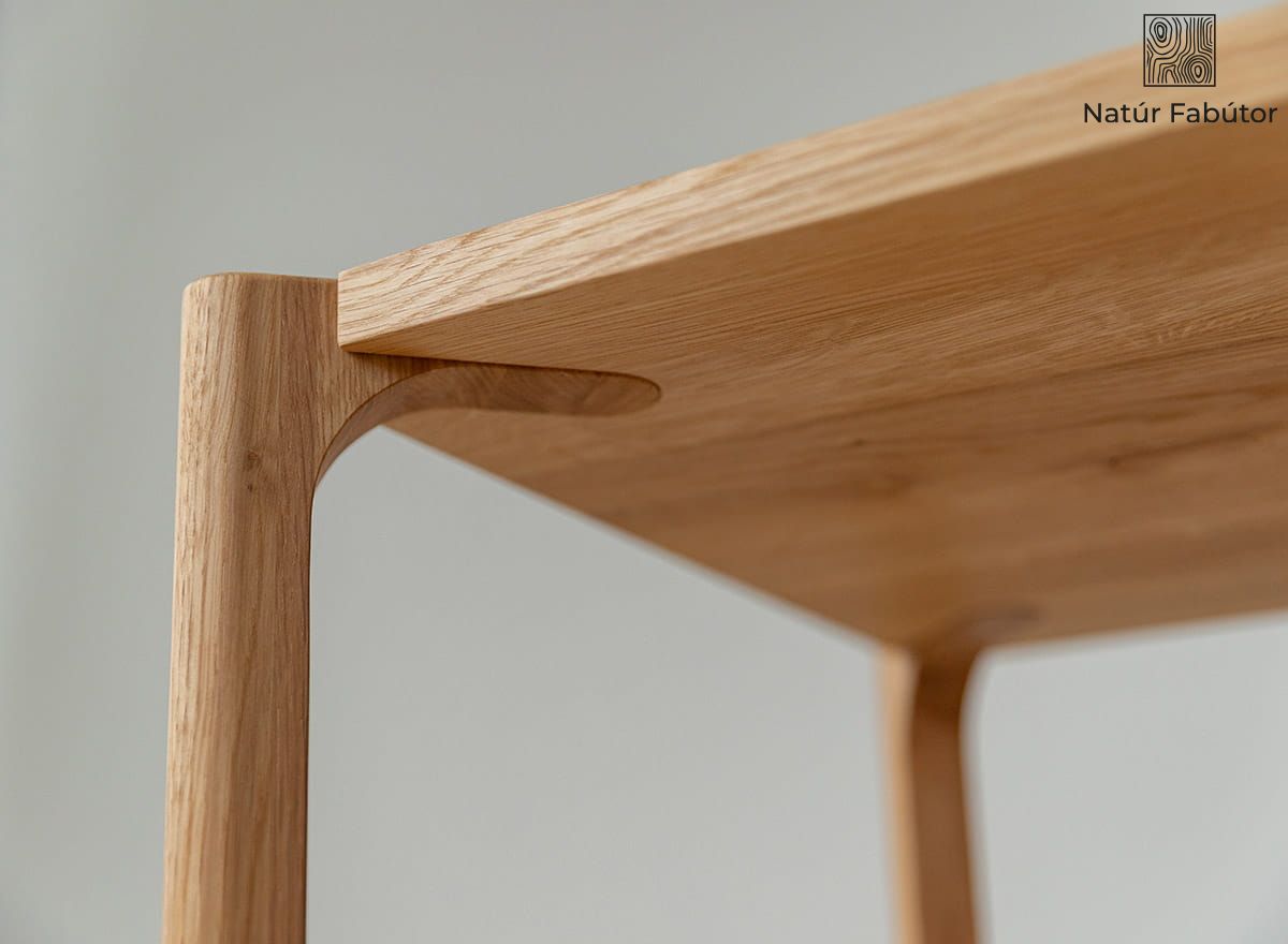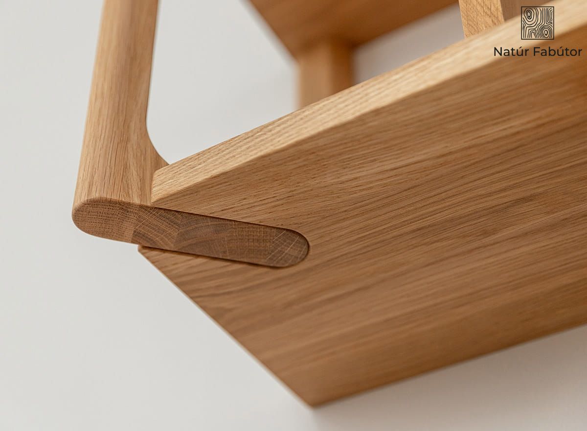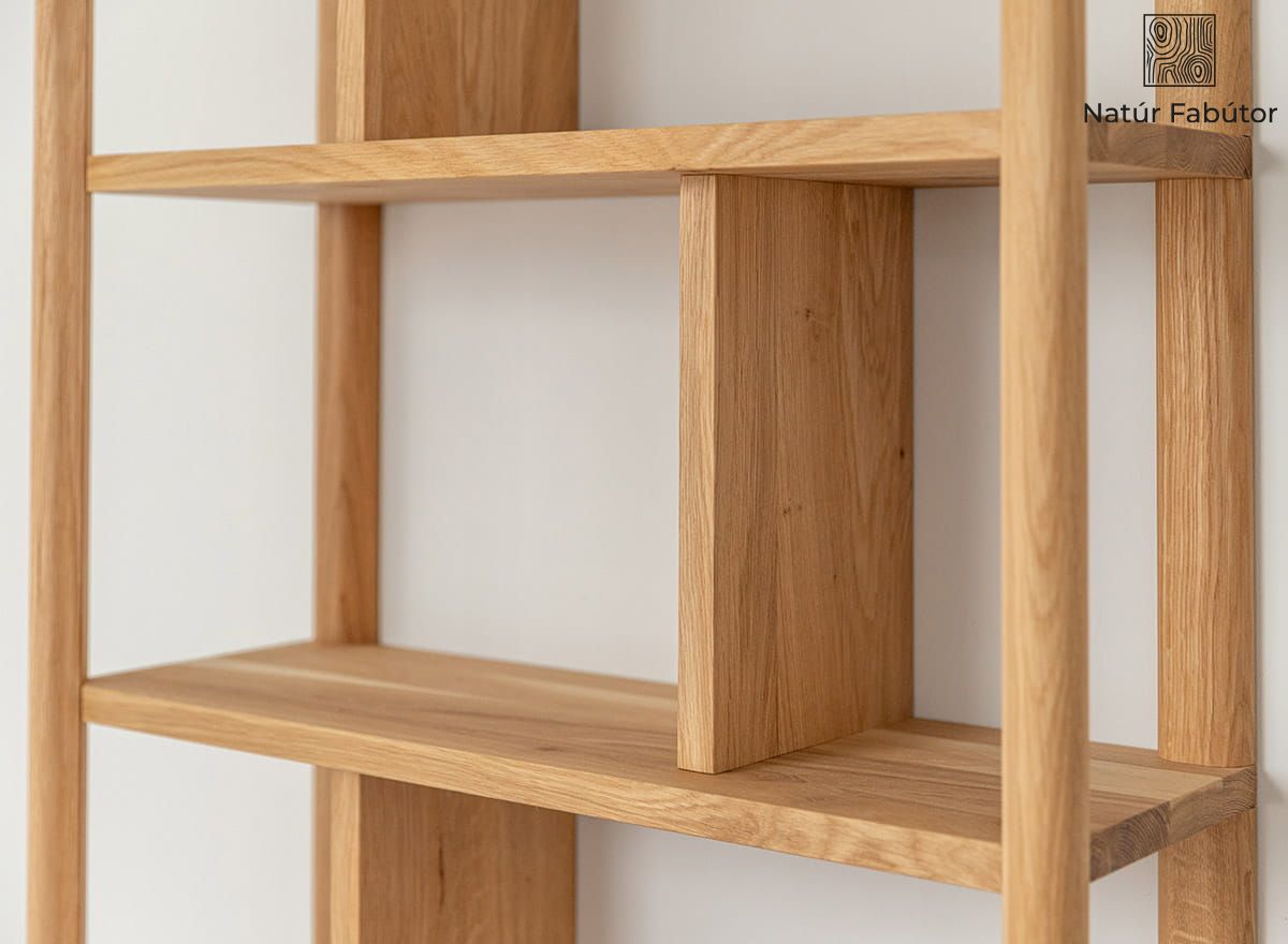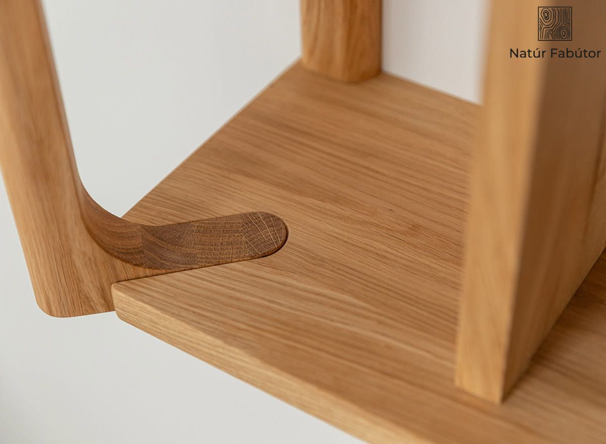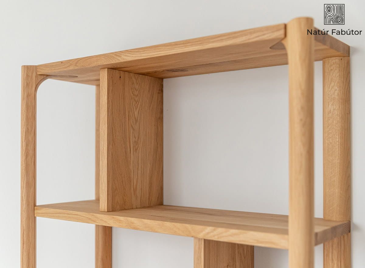 Külön figyelmet fordítottunk a felület kezelésére is, amelyet természetes Borma olajjal vontunk be. Ez az anyag hatékony védelmet nyújt, miközben kiemeli a fa szerkezetét – pontosan ezt a hatást kívántuk elérni. A félmatt felület elegáns, visszafogott fényt ad a fának: nem csillog, de mégis nemes megjelenést kölcsönöz neki. A precíz illesztések, a kiváló kivitelezés és a könnyed forma együtt egy esztétikus, ugyanakkor stabil bútort eredményeznek, amely hosszú évtizedekig szolgálhat. A felszerelése egyszerű, és a polc kiválóan elbírja a könyvek vagy dekorációk súlyát.