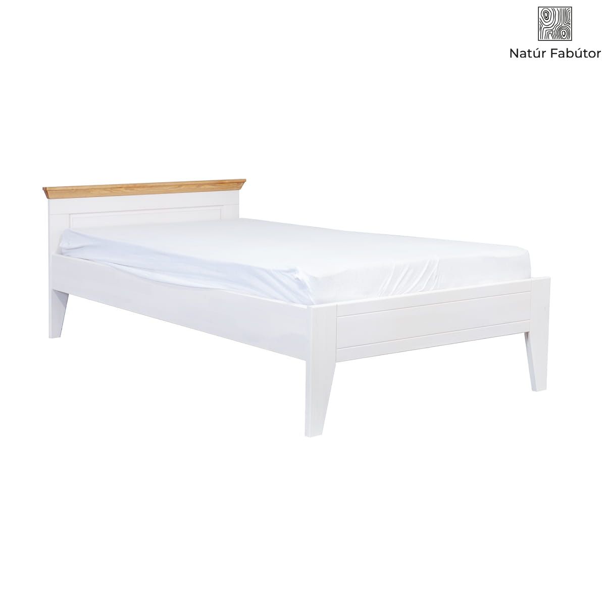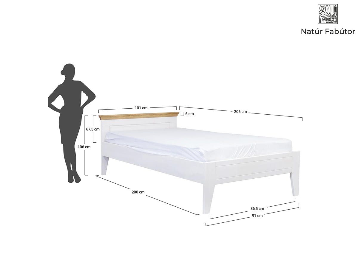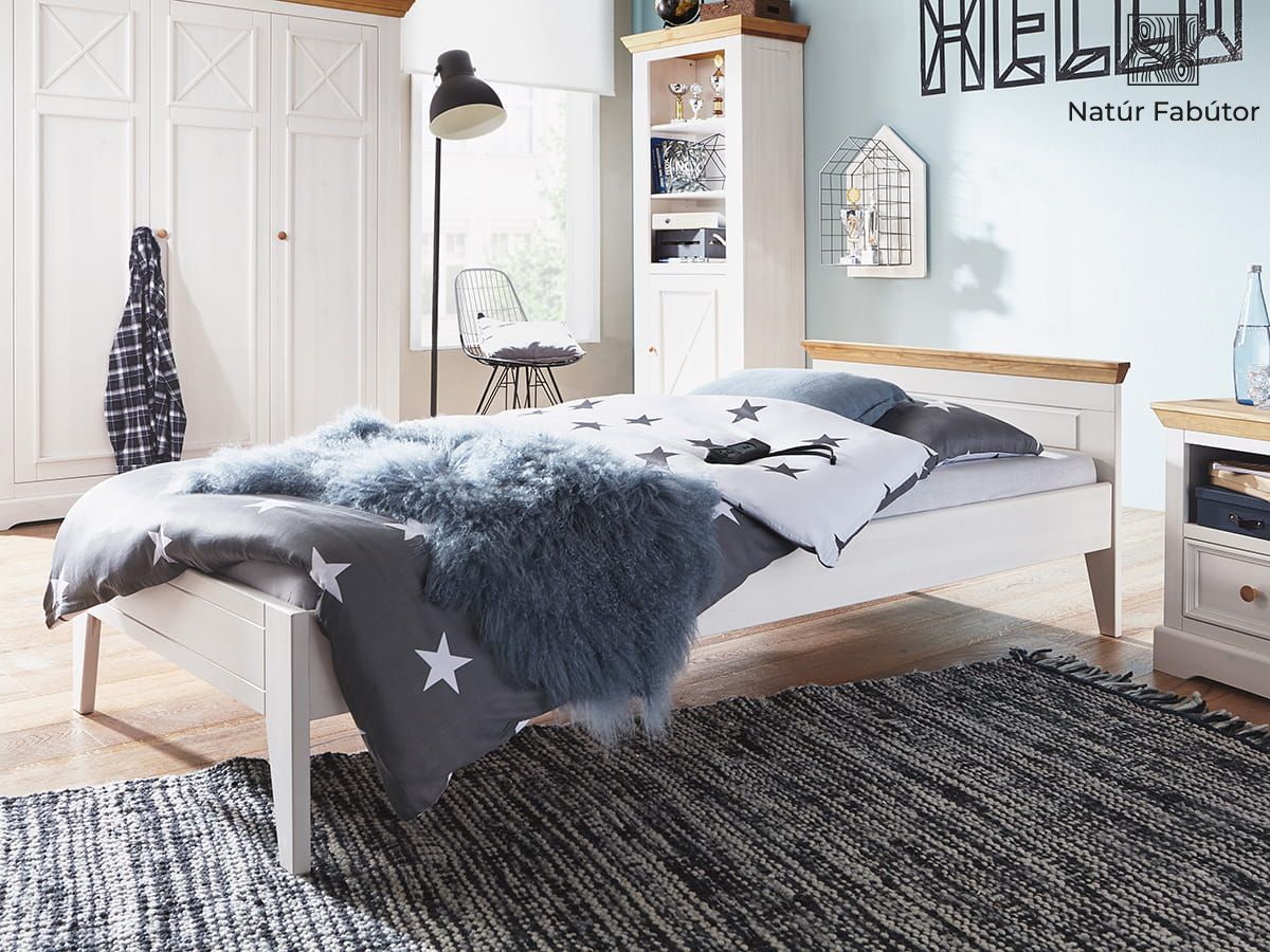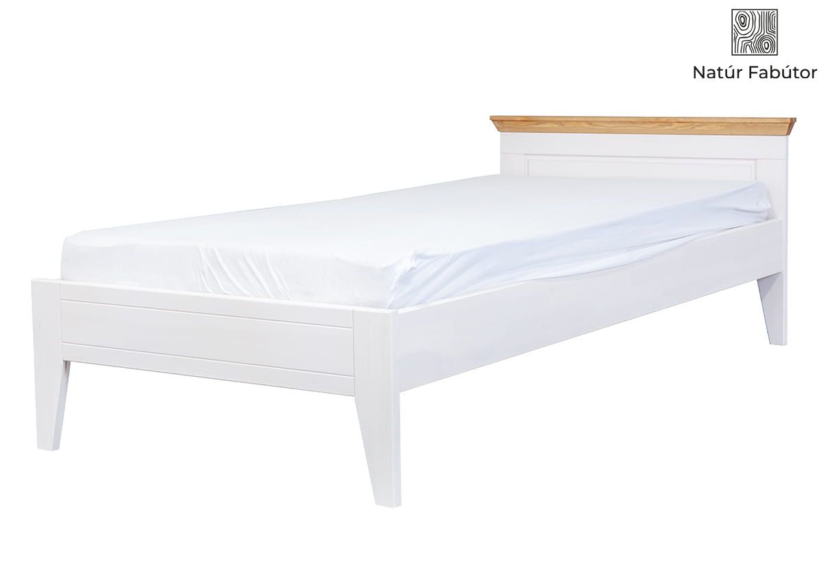 Az ágy tömör fenyőből készült és fehér színű viaszfestékkel van bevonva. A bevonat fedése körülbelül 75%-os, így alatta látható a fa erezete és a csomók. Ezáltal egy egyedi bútort kap, hiszen nincs két egyforma darab. A fejtámla tetején lévő felső keret mézszínű fenyő árnyalatú, amely megtöri a fehér szín monotóniáját és egyediséget ad a teljes bútordarabnak.