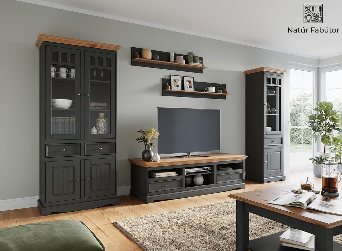 A grafitszínű bútortest ellenállhatatlanul látványos módon kapcsolódik a természetes fából készült asztallappal, melyen a fa szabálytalan erezete egyedi mintát alkoti. Ha végig húzzuk a bútor felületén az ujjunkat, akkor tapintással is jól érzékelhető a fa struktúrája. A faasztal nemcsak mesébe illően bájos, hanem igen hasznos is. Nyugodtan le tudja tenni az asztallapra a bögrét, újságot vagy a könyvet, az alsó polcon pedig a naponta használt, kisebb tárgyaknak tud állandó helyet biztosítani. A bútor színe, a képernyők eltérő színbeállítása miatt, minimálisan eltérhet a valóságban.