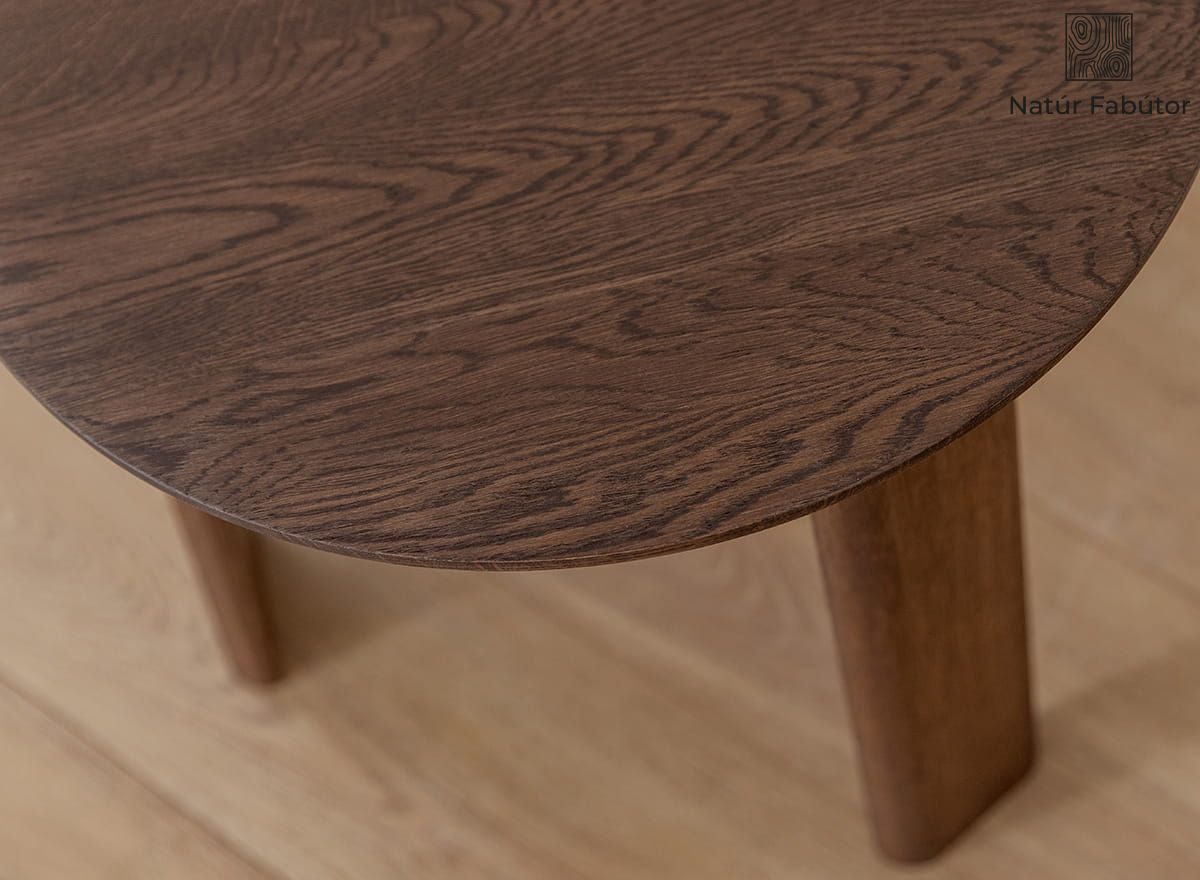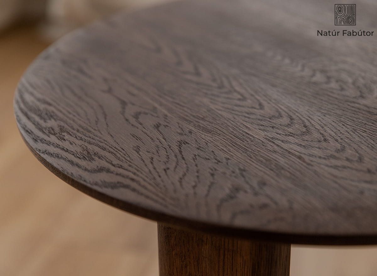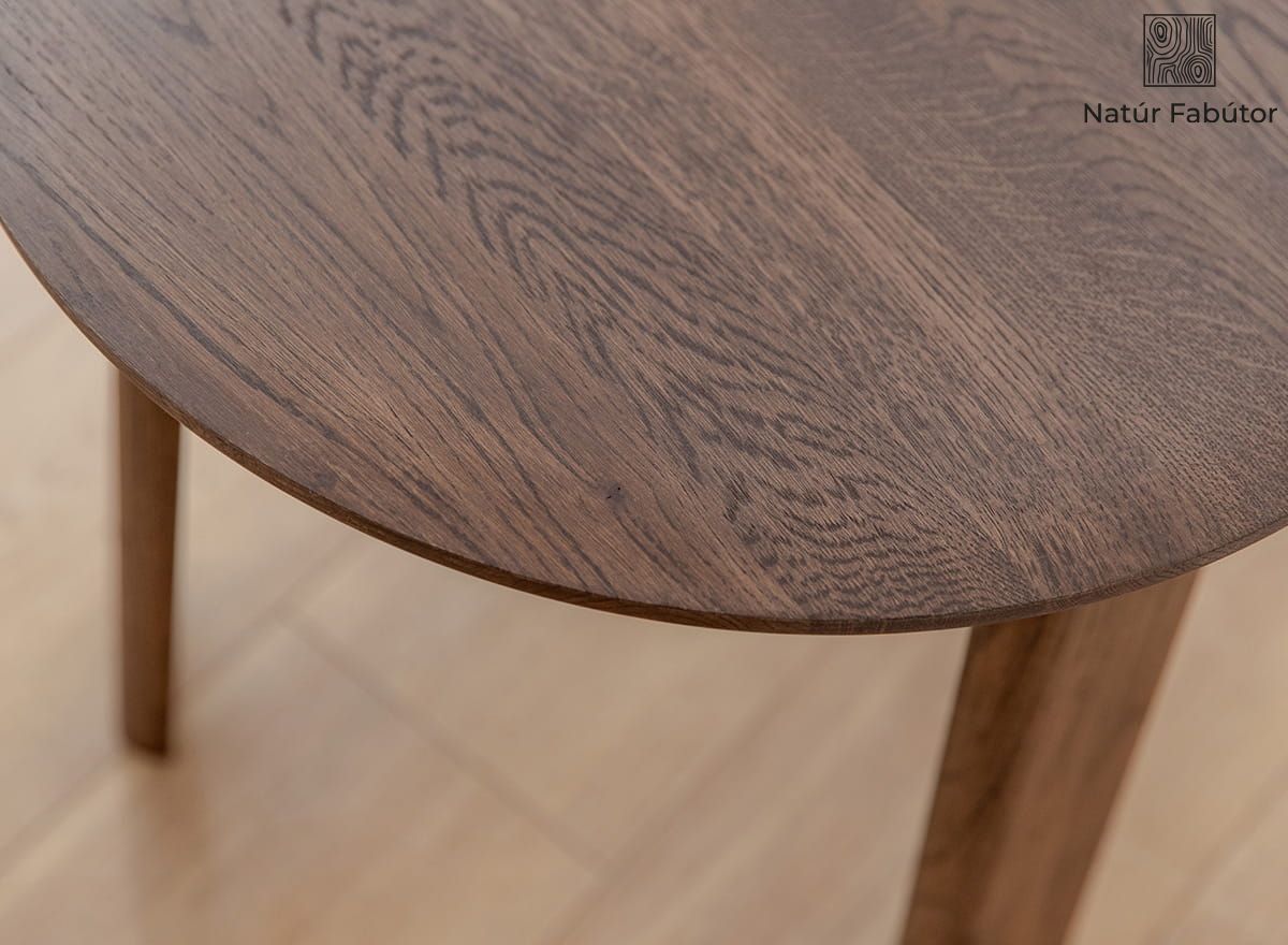A dohánybarna árnyalatú tömör tölgyfa az egyik legnagyobb erénye a Monti kollekció ezen asztalának. Sötét, olajozott felülete kiemeli a fa különleges szerkezetét, az erezeteket és a görcsöket, amelyek egyedivé és megismételhetetlenné teszik ezt a bútort. Ez a legmagasabb színvonalon elismert anyag az asztalos szakmában. Az asztallap sima és kellemes tapintású, míg sötétebb árnyalata rendkívül elegáns. Ezen felül kiemelhető a stabilitása is – még maximális terhelés mellett sem ingadozik.