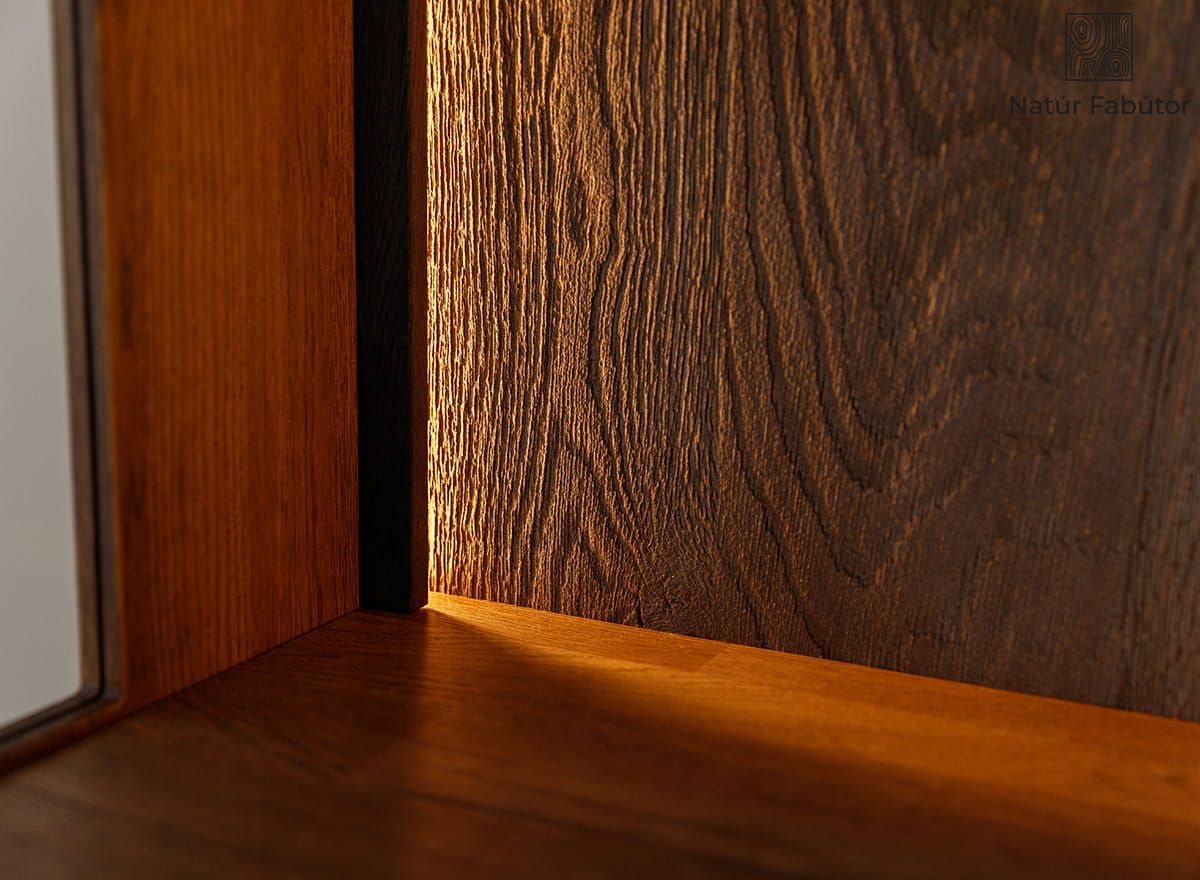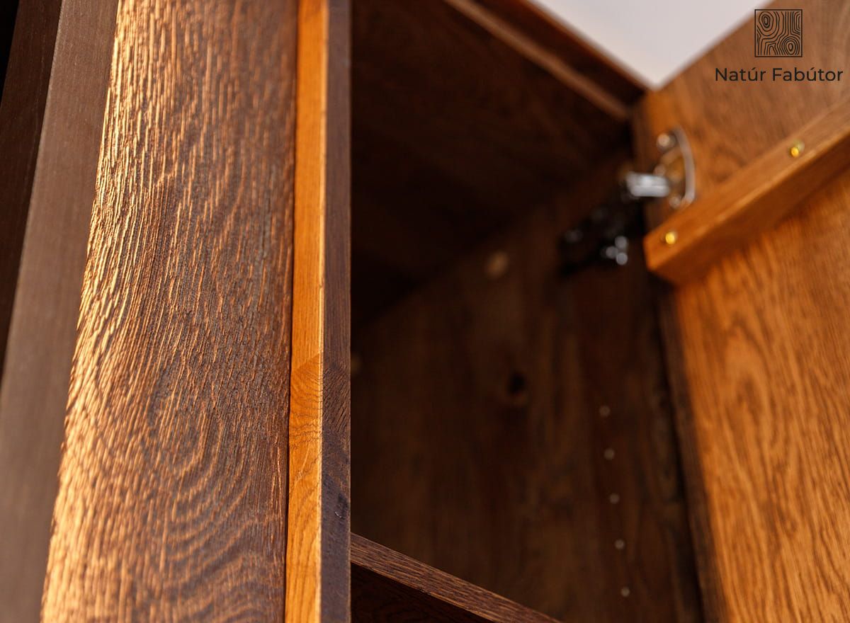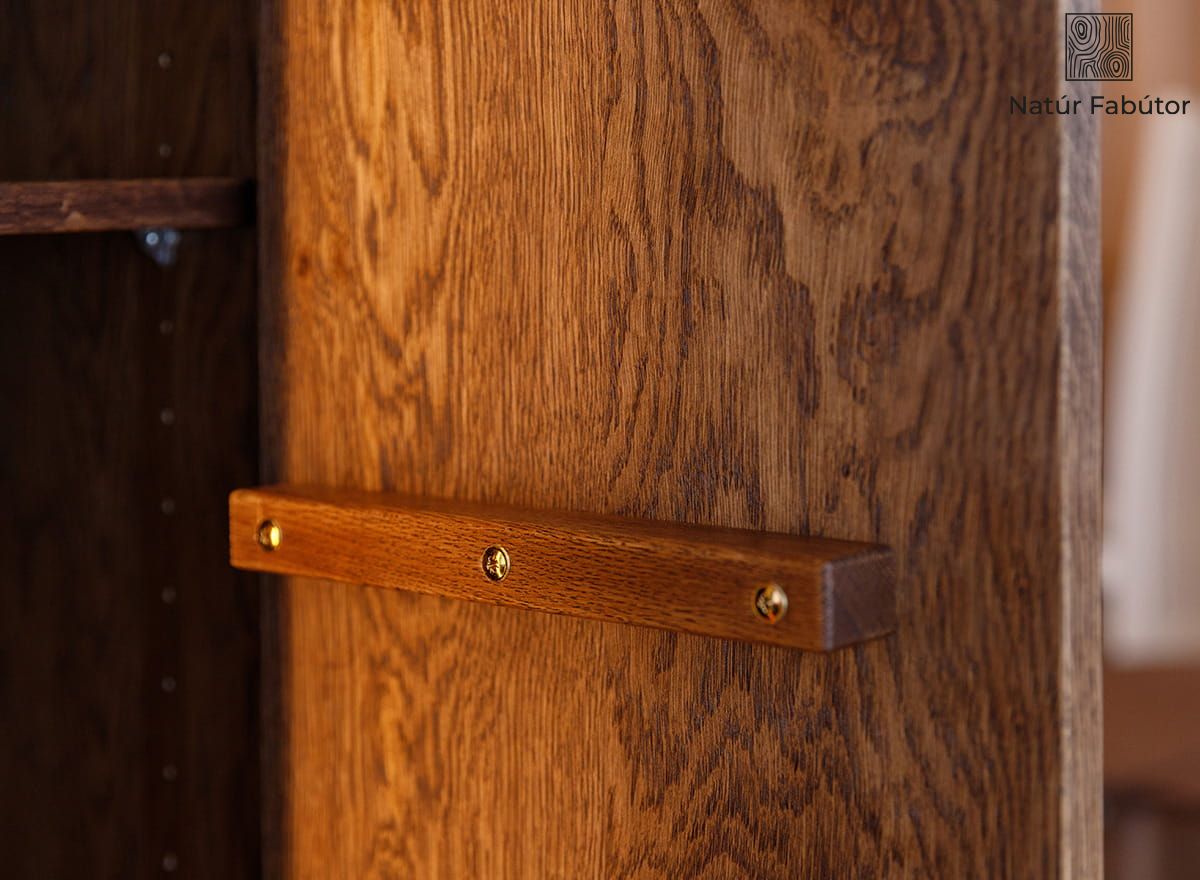 A kivitelezés minősége tökéletes összhangban van a praktikumával. A természetes faanyag, a precízen kidolgozott élek és a tip-on rendszer mind a mindennapi kényelmet szolgálják. Az ajtók nyitásához elegendő egy könnyed nyomás – fogantyúk és felesleges részletek nélkül. A stabil szerkezet biztosítja, hogy a vitrin terheléstől függetlenül szilárdan álljon. Végül is ez egy olyan bútor, amelyet hosszú évekre terveztek, kompromisszumok nélkül, mind az esztétikum, mind a tartósság terén. További előnye, hogy a bútordarab összeszerelve érkezik, így azonnal élvezheti funkcionalitását, mindenféle szerelés és szerszám nélkül.