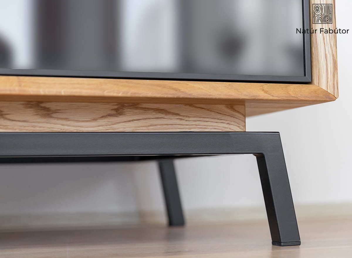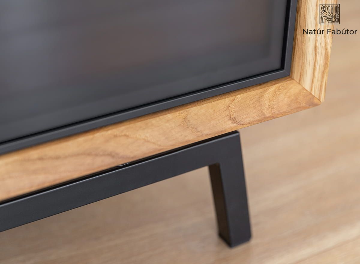 A természetes fa időtálló anyag, amely a gyakran változó trendek ellenére sem megy ki a divatból, így érdemes helyet találni neki otthonában. A meleg színű tölgyfa komód fekete fémkerettel lett kiegészítve, ami könnyedséget kölcsönöz a masszív darabnak, így vizuálisan nem nyomja el a belső teret, akárcsak a termékcsalád többi darabja. A klasszikus fogantyúk nélküli fiókok minimalista formájúak, és a tip-on rendszerrel nyithatók, csak az utolsó, sötét üvegfrontú fiókban van egy kis fogantyú, amely beleolvas az üveglap színébe. A bútor színe - a monitor beállításaitól függően - változhat.