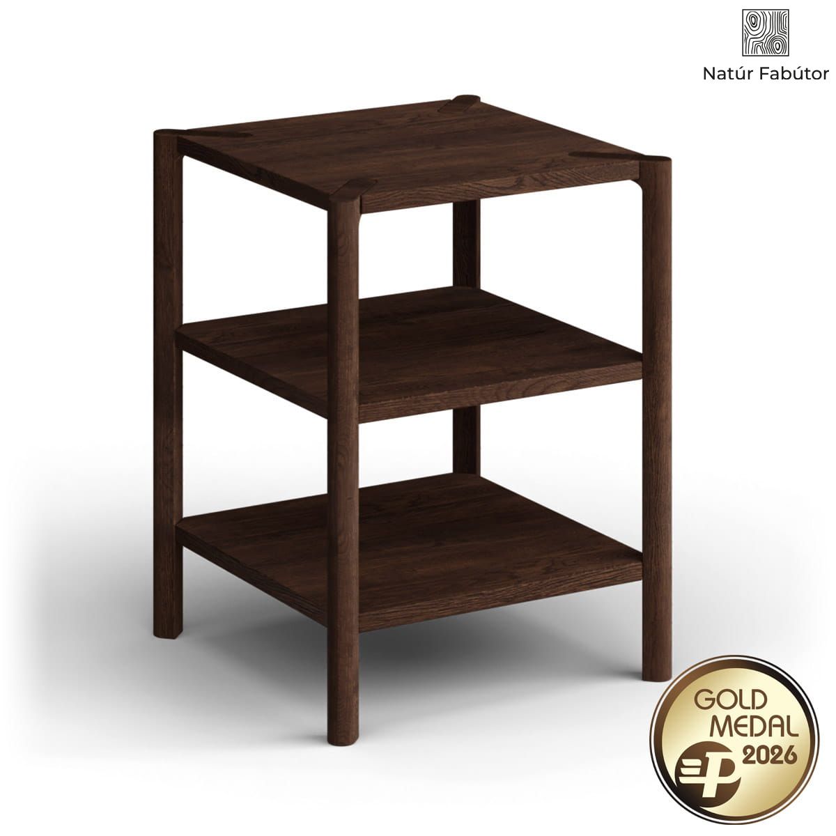 A konstrukció alapját a precízen illesztett elemek adják – még kis méretben is jól látható a részletekre fordított különleges figyelem. A dohányszínű tölgyfa polc tökéletesen kiegyensúlyozott, nem inog, és terhelés alatt sem veszít stabilitásából.