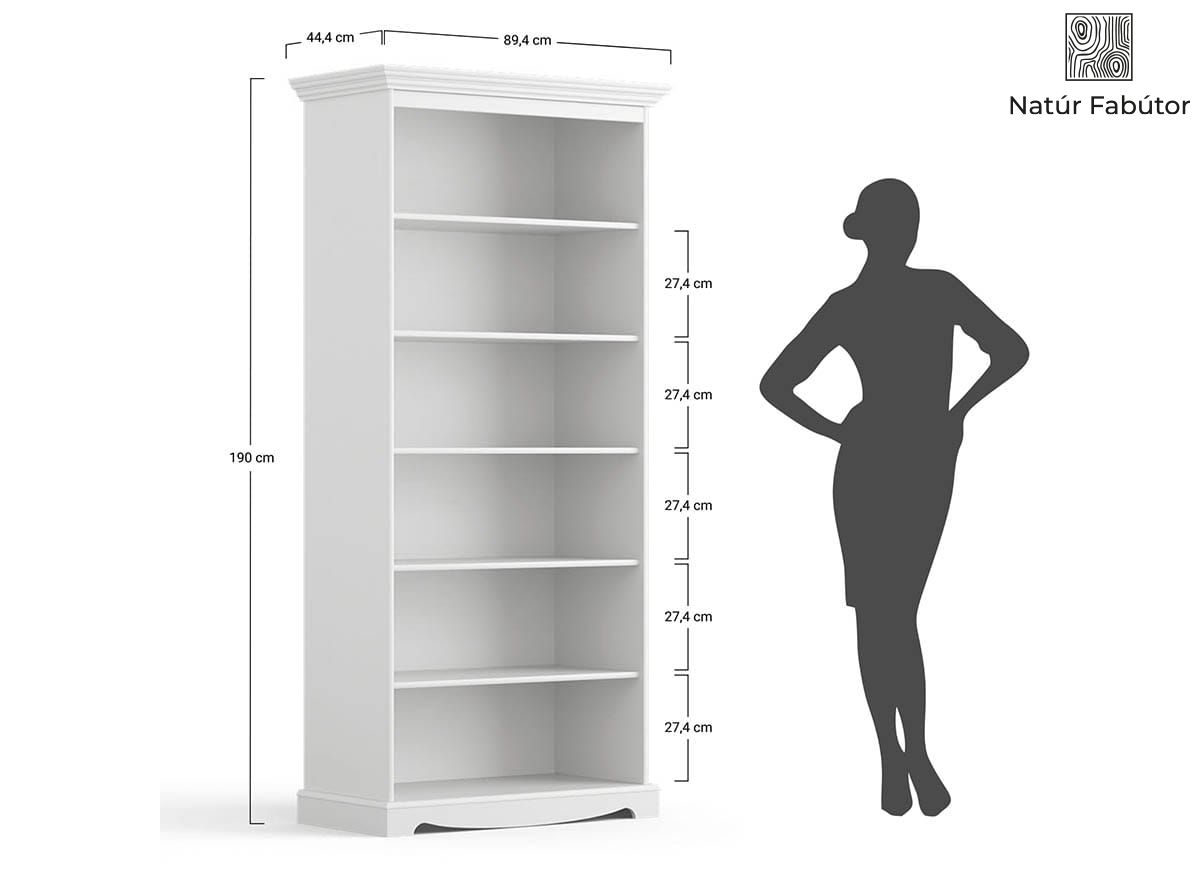 A fehér fabútorok kiválasztásakor fontos figyelembe venni a természetes öregedési folyamatot és azt, hogy az évgyűrűk és erezetek idővel jobban láthatóvá válnak. Környezetbarát, 85%-os UV-fixálással rendelkező, vízbázisú festékkel festettük le a bútort. Belülről a könyvespolcot egy rétegben vízbázisú festékkel festettük le, így láthatóvá válnak az egyedi erezetek és csomók (elhalt ágkezdemények). A fenyőbútorok karbantartásakor érdemes ügyelni arra, hogy ne használjunk durva rongyokat és konyhai tisztítószereket erre a célra - ezek károsíthatják vagy elszínezhetik a felületet. A legjobb, ha nedves, puha ruhát használ. Nem ajánlott a bútorokat közvetlen UV-sugárzásnak kitenni, illetve fűtőberendezések közelében elhelyezni. A bútorokat csomagban, lapraszerelve szállítjuk, az összeszereléshez szükséges utasításokkal és tartozékokkal együtt.