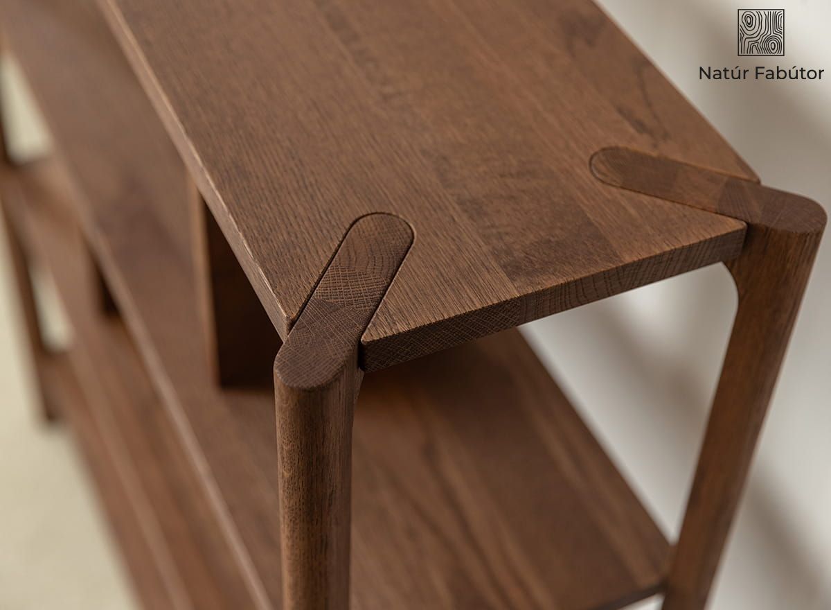 A tömör tölgyfa sötét, dohányszínű árnyalatban az időtállóságot és a kifinomult stílust egyesíti. Felületét Borma olajjal kezelték, amely félmatt fényt ad a fának, miközben védi a mindennapi használat során keletkező kopástól és szennyeződésektől. A gondosan megtervezett arányok, a kiegyensúlyozott vonalvezetés és a masszív szerkezeti kötések biztosítják a stabilitást és a nagy teherbírást. Ez a bútor kompromisszumok nélkül teljesít: megjelenése és használhatósága egyaránt a legmagasabb szintet képviseli.