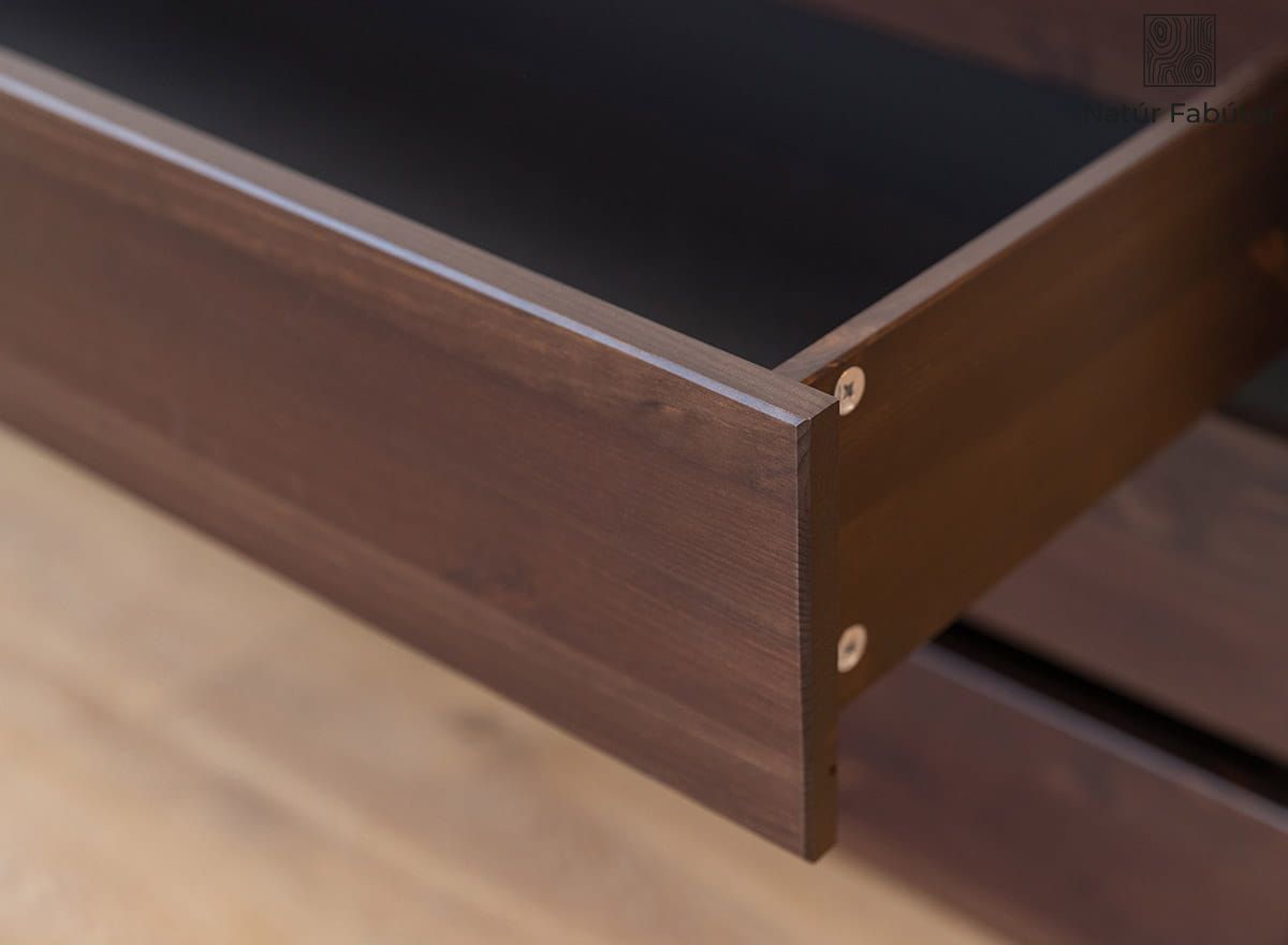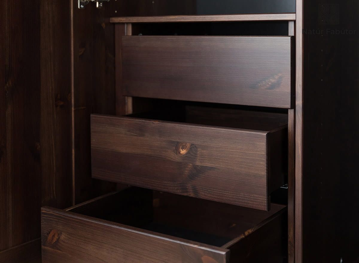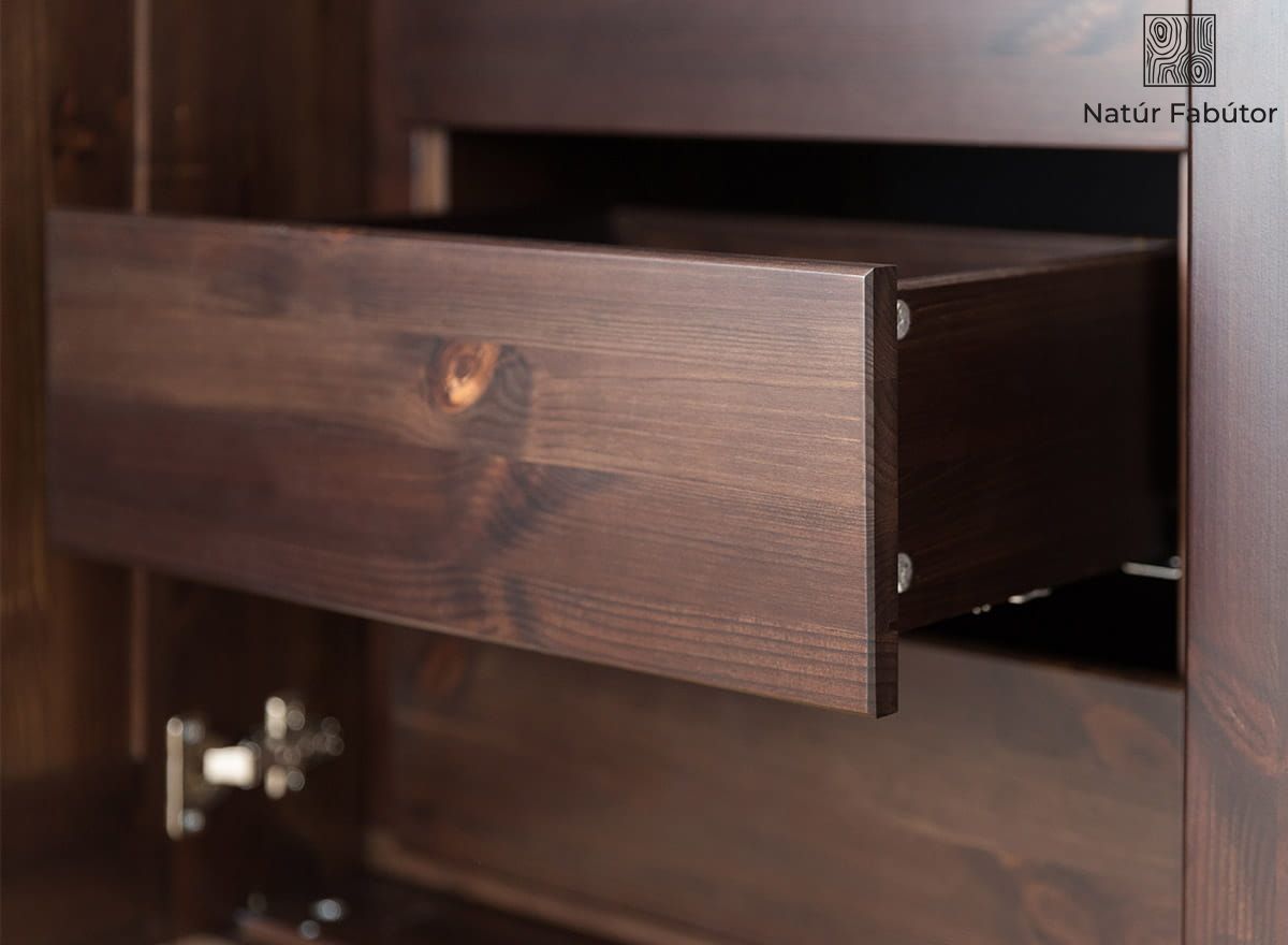 A masszív szerkezet, a precízen illeszkedő elemek és a csillapított záródású fióksínek biztosítják, hogy a modul fiókjai ellenállás nélkül nyíljanak és csukódjanak. Nincs akadozás, csapódás vagy lötyögés – csak sima mozgás, amely igazán élvezetessé teszi a használatot. Ez az a kényelem, amit gyorsan értékelni fog. A fenyőfa, amelyet környezetbarát vízbázisú festékkel kezeltek, nemcsak elegáns megjelenést kölcsönöz, hanem a mindennapi használattal szemben is ellenálló. A fehérneműs szekrény ezzel a modullal való kiegészítése lehetővé teszi, hogy annak teljes kapacitását kihasználja.