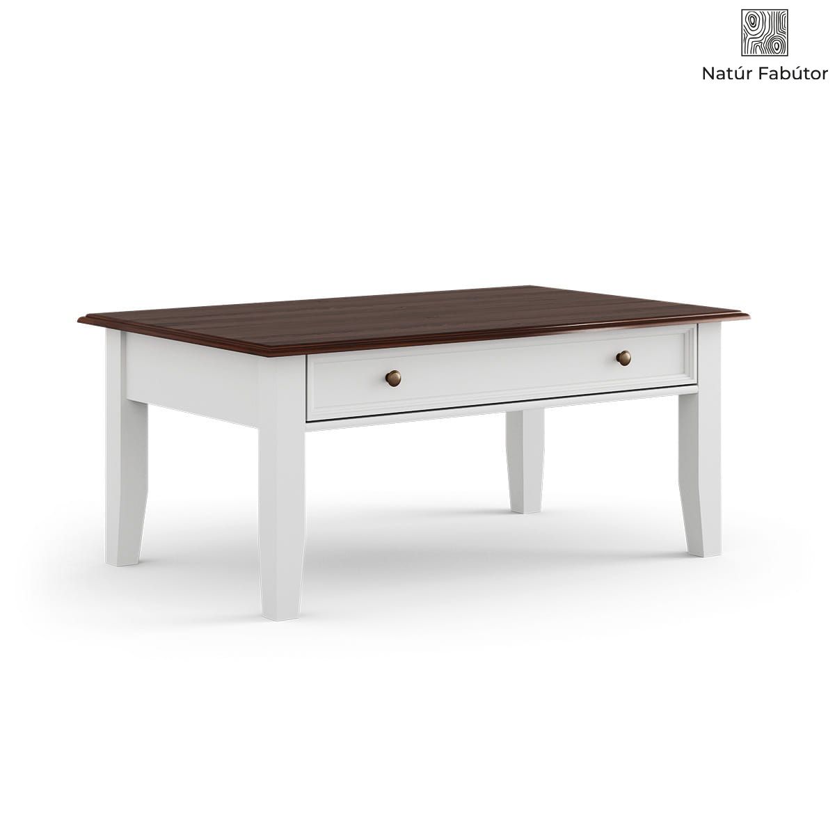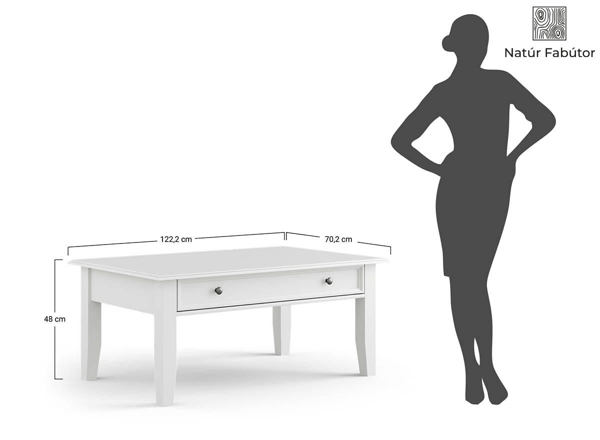 A fenyőből készült fehér kávézóasztal rendkívül funkcionális. Nemcsak széles (122 x 71 cm) és vastag (2,4 cm-rel), elegáns sötét dió színű asztallapja van, hanem egy tágas fiókja is, ahol például: különleges alkalmakra való terítőt, papírszalvétát vagy kedvenc újságjainak gyűjteményét tarthatja. A fiók Quadro golyócsapágyas fióksíneken áll. Másnéven csendes záródás mechanizmus néven is ismert. Ez azt jelenti, hogy többé nem kell aggódnia a fiókok becsapódása miatt. A sínek tartósak és nagyon halkan futnak.