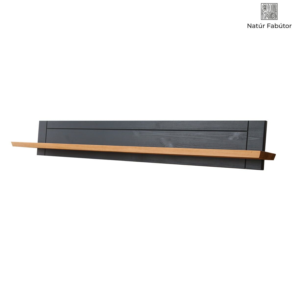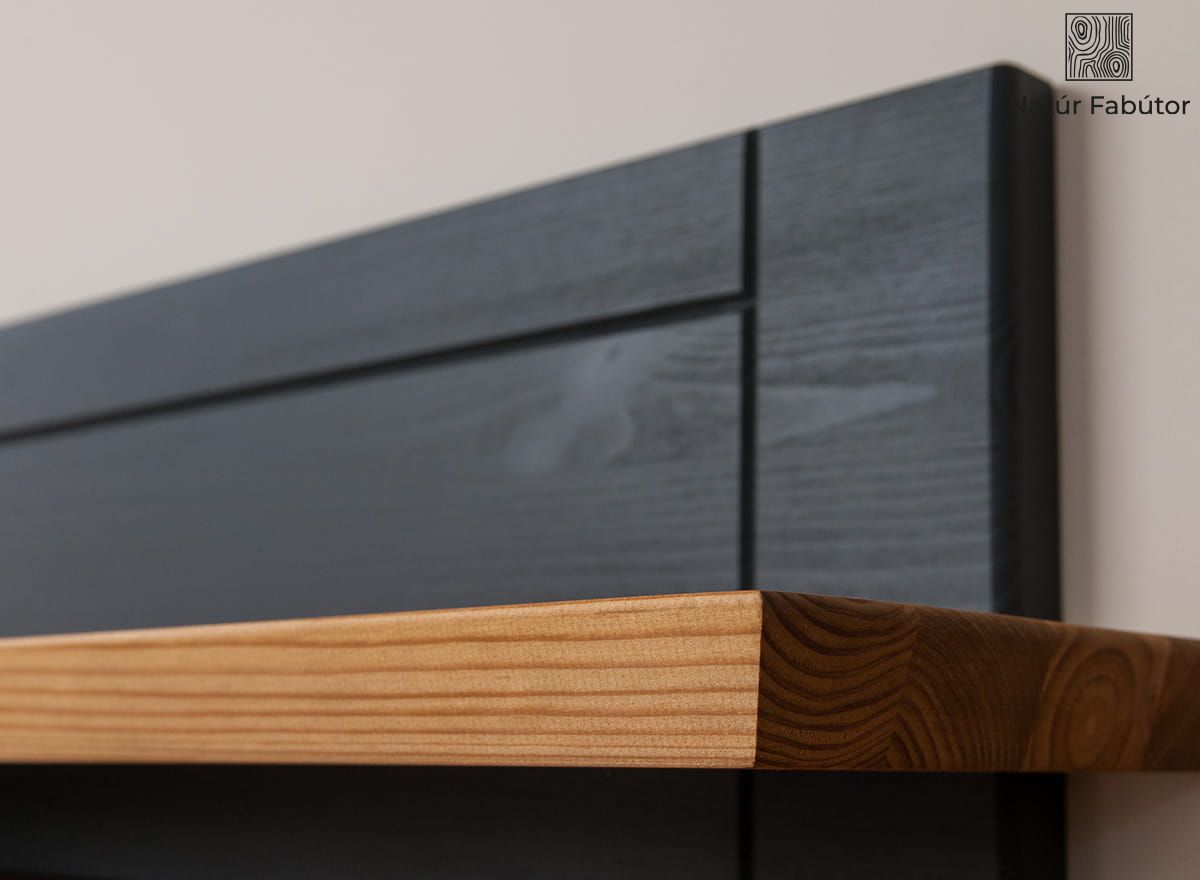 A fapolc egy lapból és egy hátsó falból áll, amely rejtett rögzítőelemek segítségével kerül a falra, így a mindennapi használat során nem láthatók. A hátsó falat mély grafit színű, környezetbarát, nem teljes fedésű vízbázisú festékkel festették. A polc lapja tölgy színű maradt. A természetes tölgyfa árnyalata szépen illeszkedik az elegáns és modern grafithoz. A polc lapján jól láthatók a csomók és a fa természetes erezete. A fa szerkezete a grafit réteg alatt is látható, emlékeztetve a polc anyagának eredetére és nemességére. A hátsó falat könnyed, egyszerű marások díszítik.