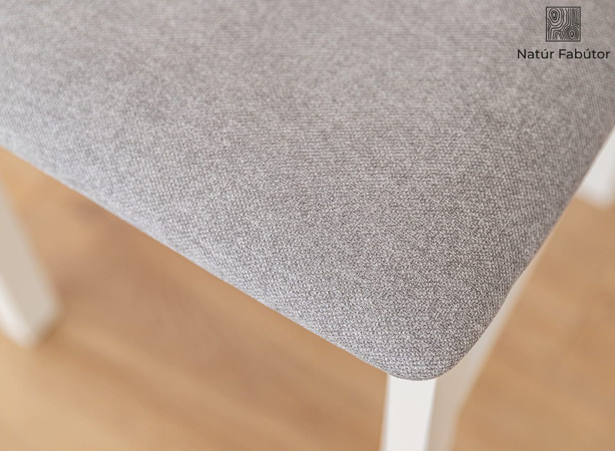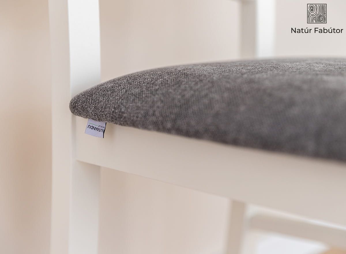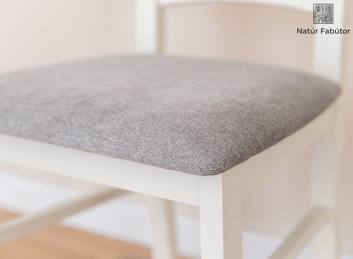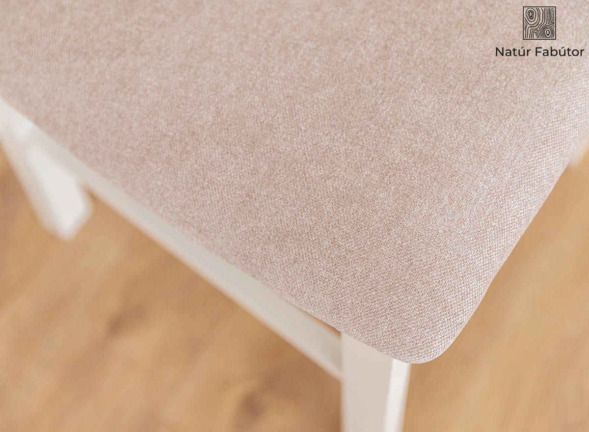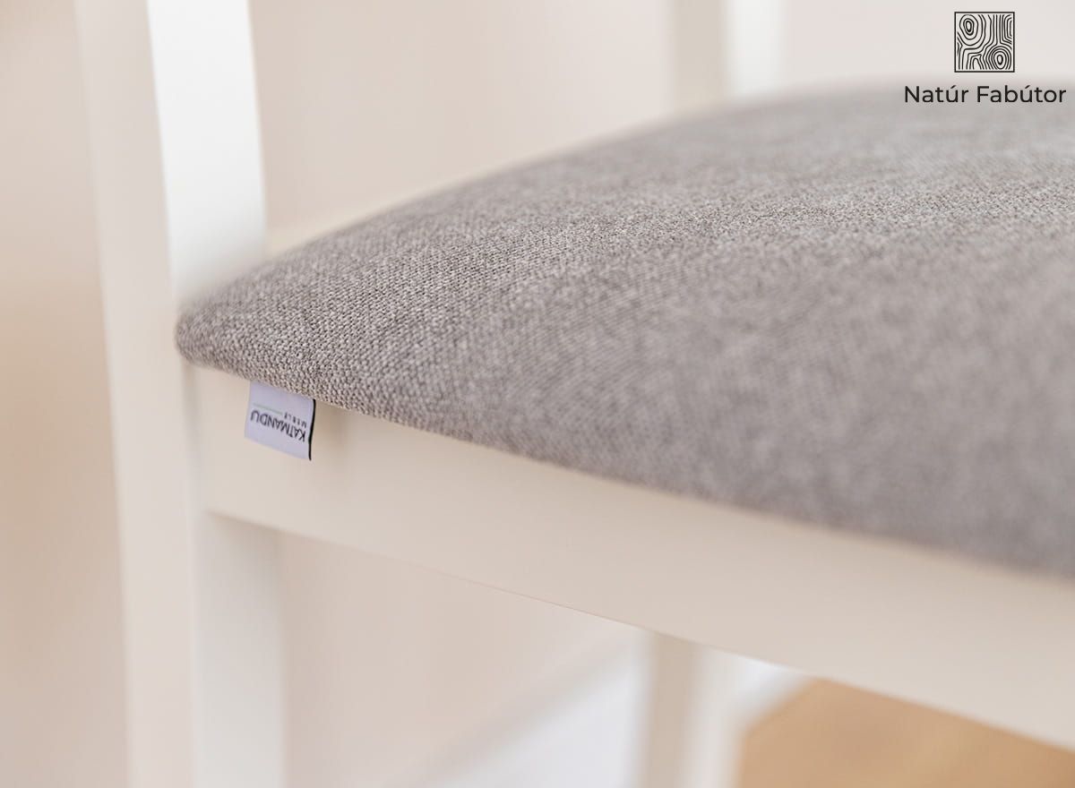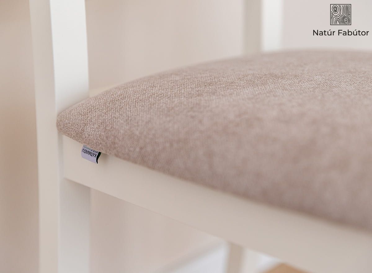 A széket természetes, vízbázisú, lágy, krémfehér színű festékkel vontuk be. A festék nem fed teljesen, így a fa értékes textúrája átsejlik a festékrétegen. A szék széles ülőfelülete puha kárpitanyaggal van bevonva. Akár egy tucatnyi kárpit szín közül is választhat. A széles választék azt jelenti, hogy a széket saját ízlésének, valamint az étkező vagy a nappali berendezésének színeihez igazíthatja. A világos, hűvös, visszafogott árnyalatokban és sötét, mély, telített színekben egyaránt elérhető. Biztos, hogy minden vásárló megtalálja a számára megfelelő színt.
