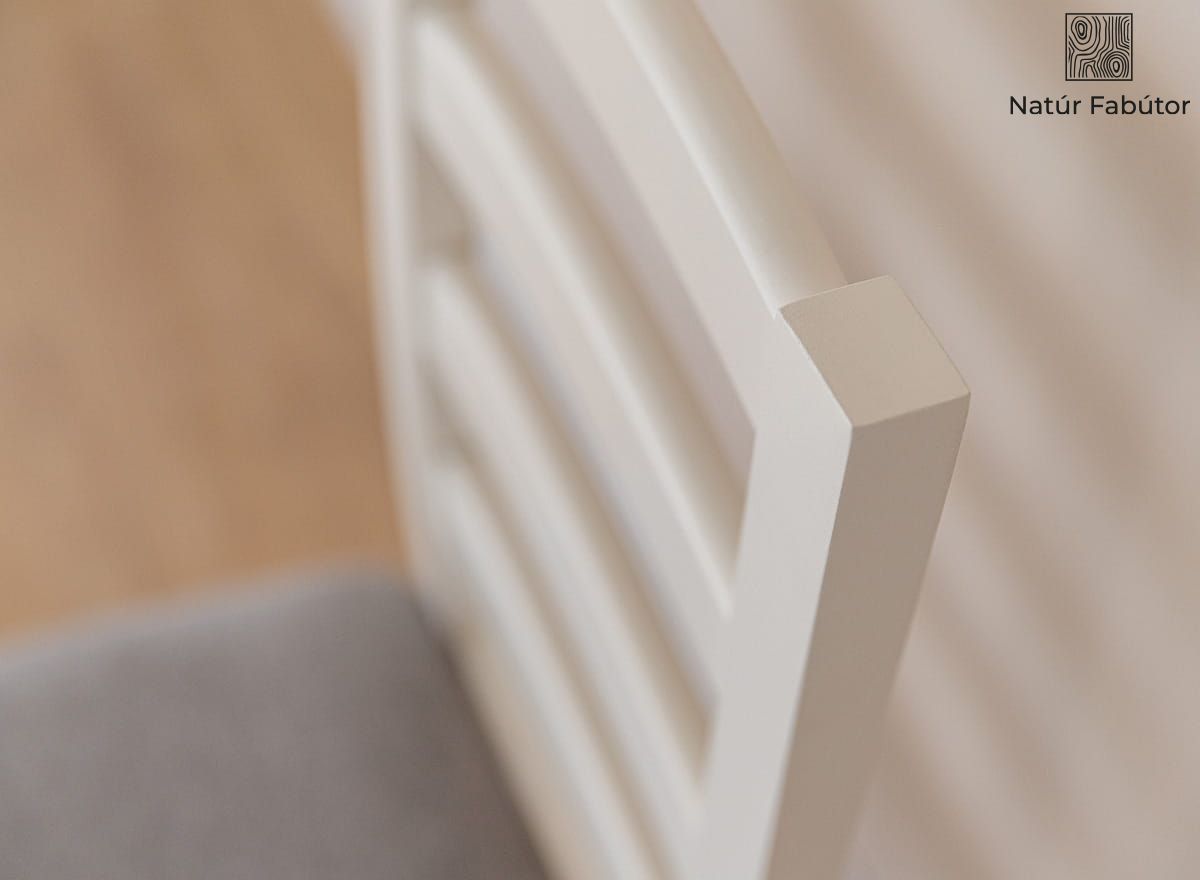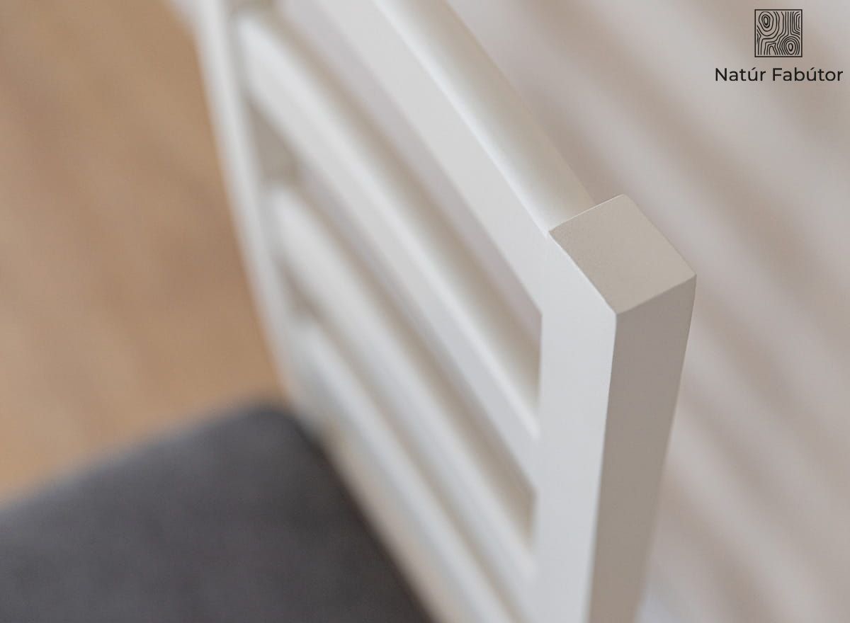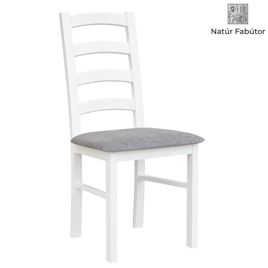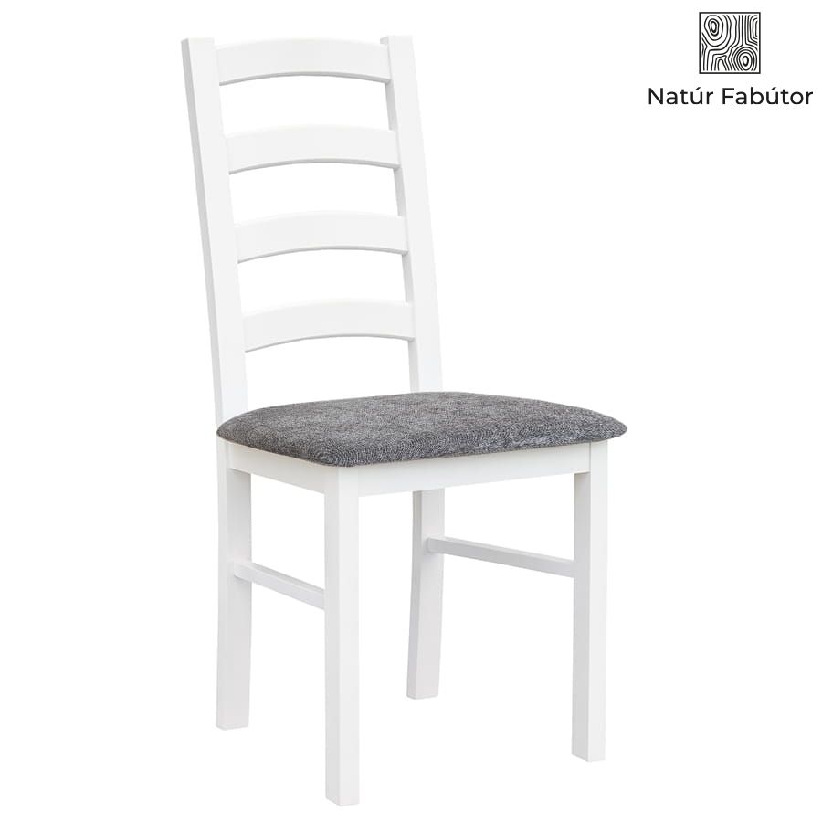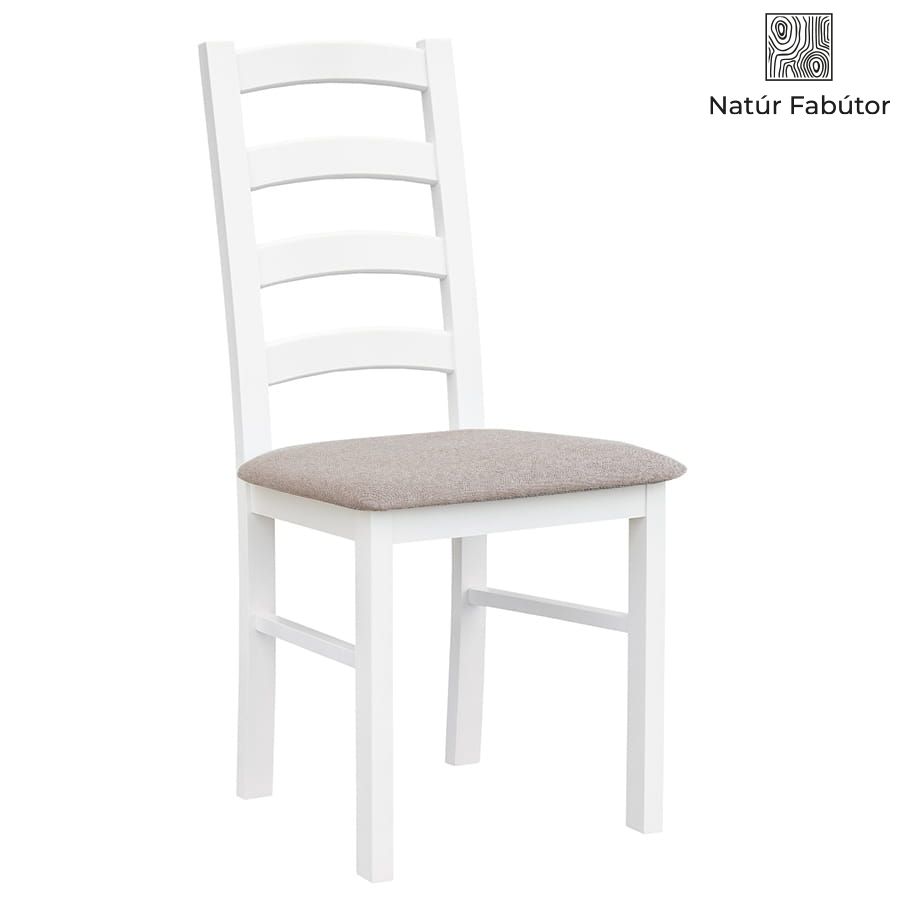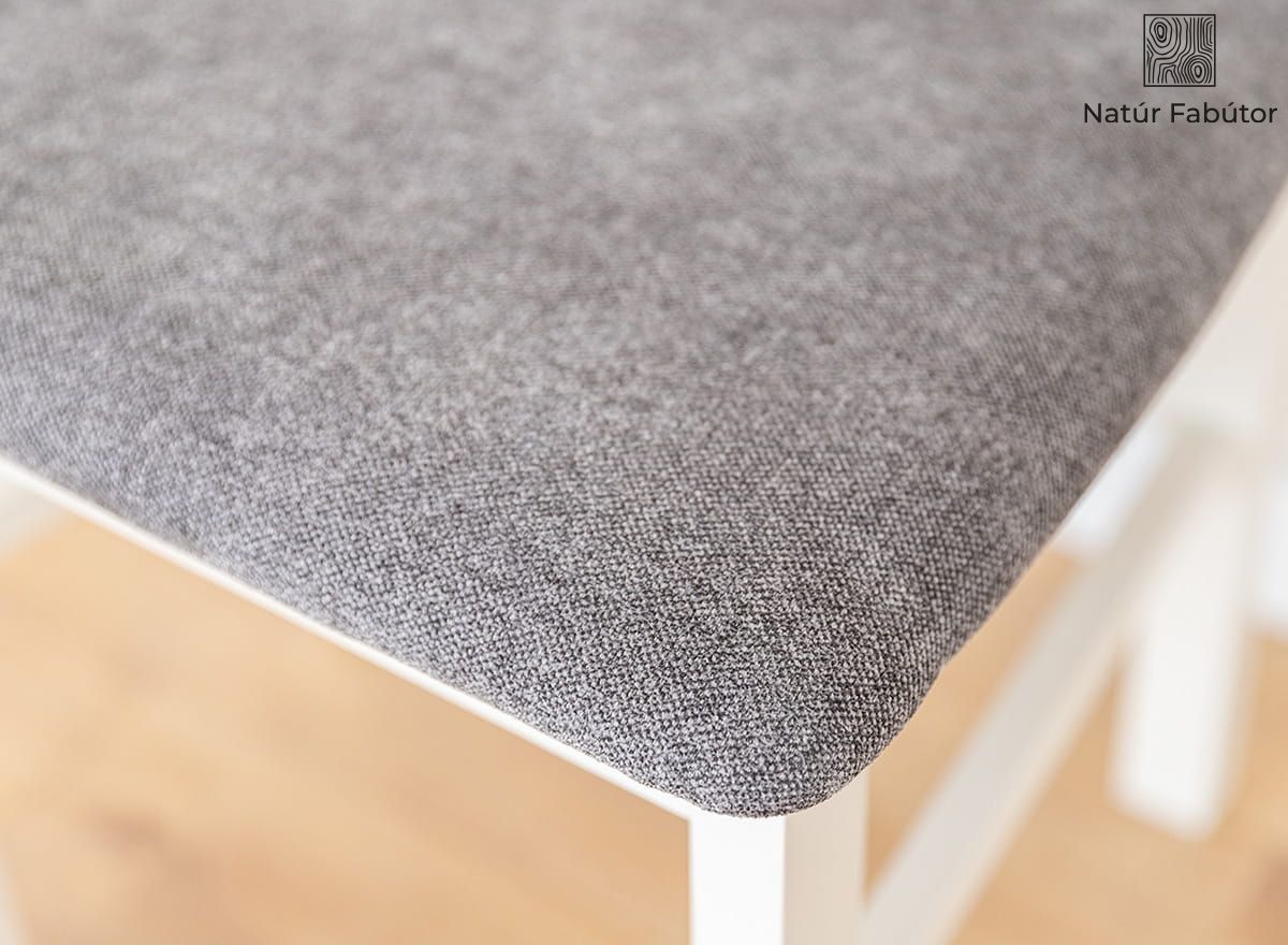 A széket természetes, vízbázisú, lágy, krémfehér színű festékkel vontuk be. A festék nem fed teljesen, így a fa értékes textúrája átsejlik a festékrétegen. A szék széles ülőfelülete puha kárpitanyaggal van bevonva. Akár egy tucatnyi kárpit szín közül is választhat. A széles választék azt jelenti, hogy a széket saját ízlésének, valamint az étkező vagy a nappali berendezésének színeihez igazíthatja. A világos, hűvös, visszafogott árnyalatokban és sötét, mély, telített színekben egyaránt elérhető. Biztos, hogy minden vásárló megtalálja a számára megfelelő színt.