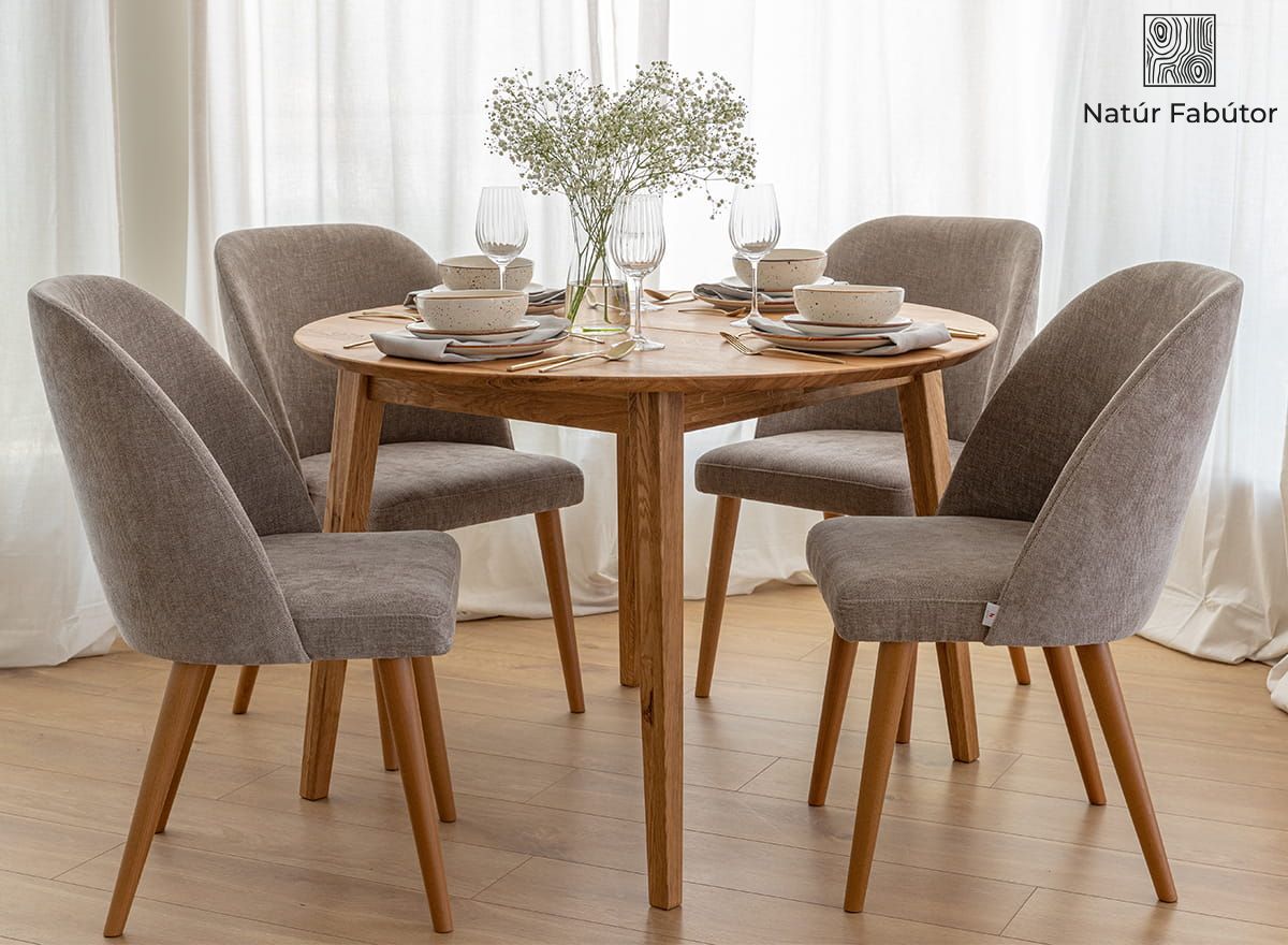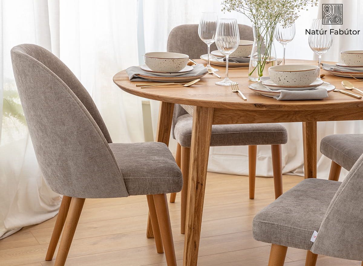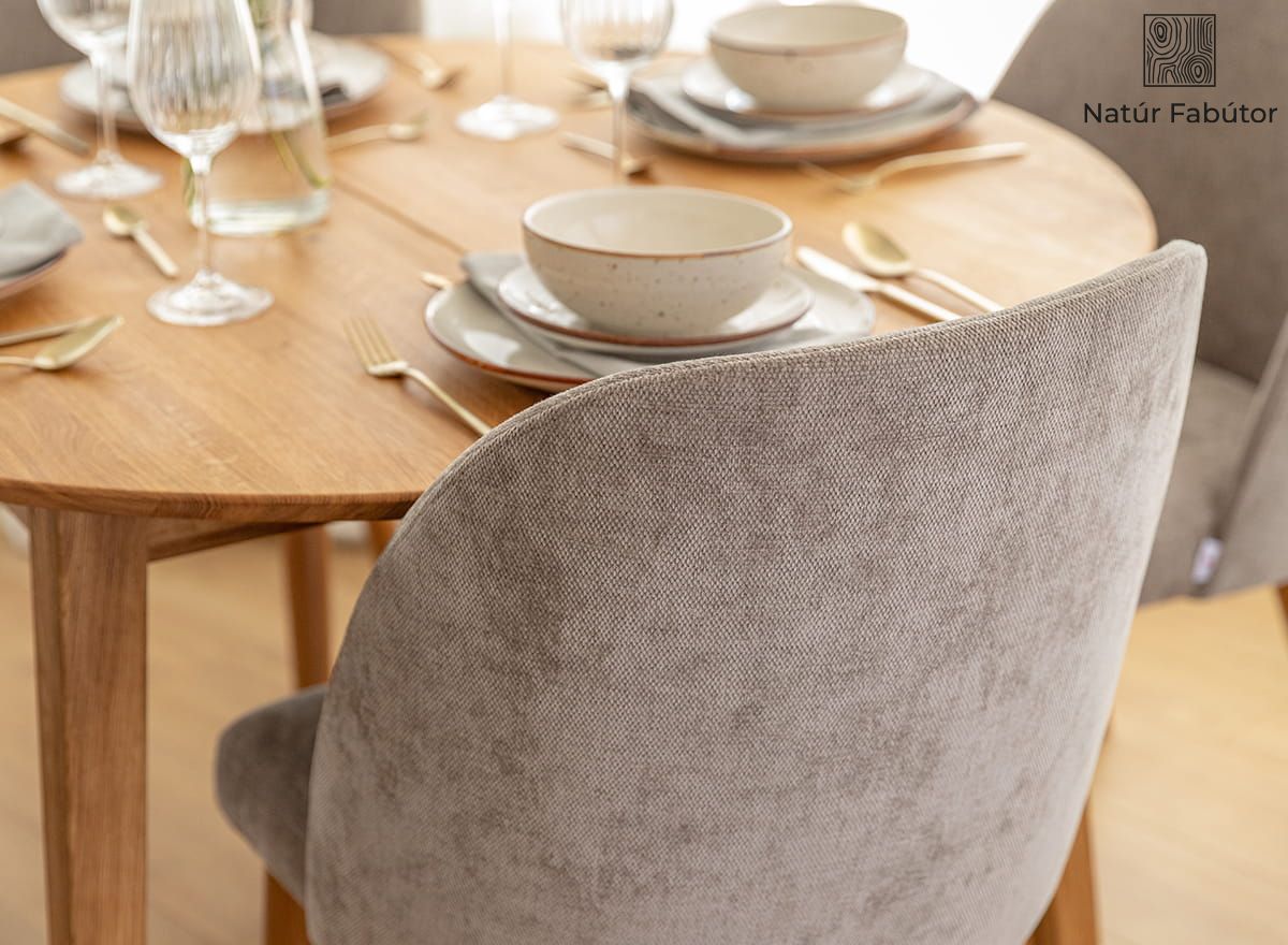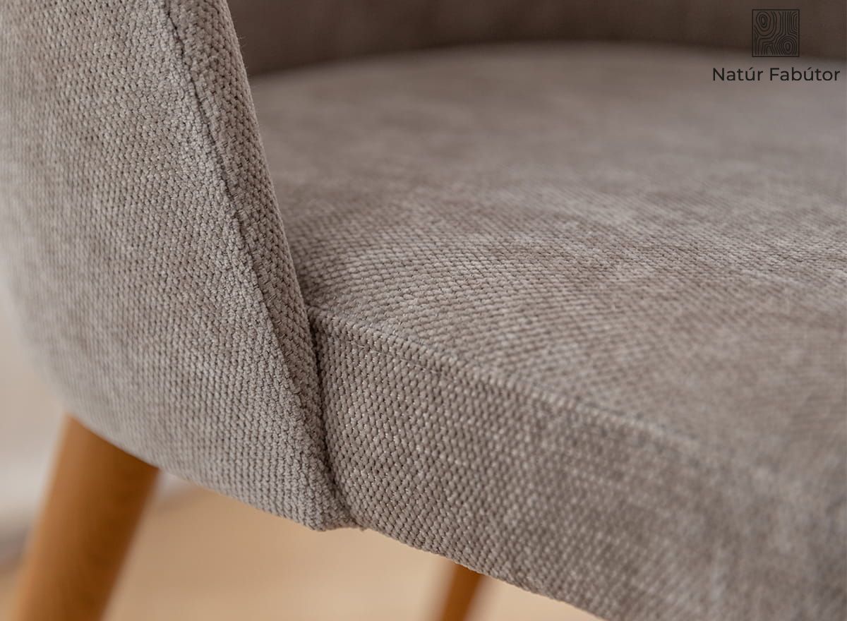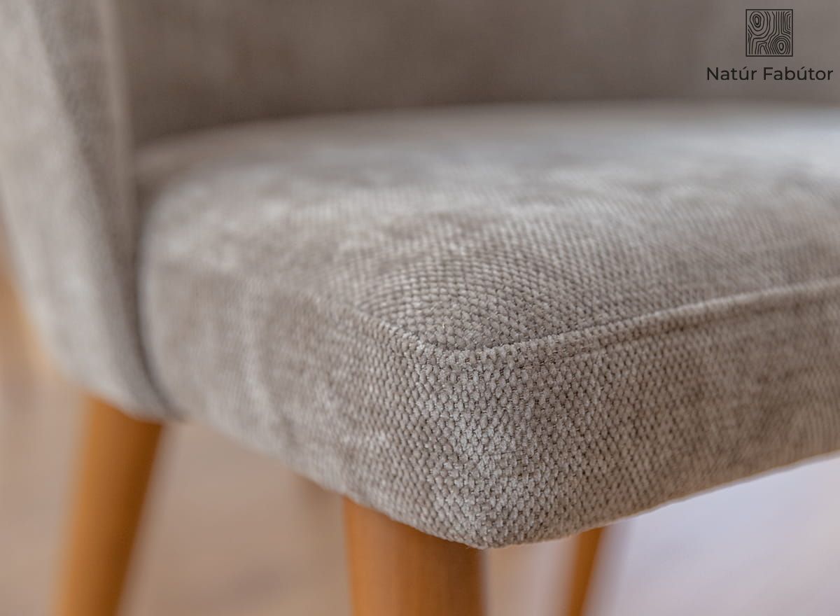 Egy szék, amelyen a szürke bézs szín harmonikusan keveredik a fával