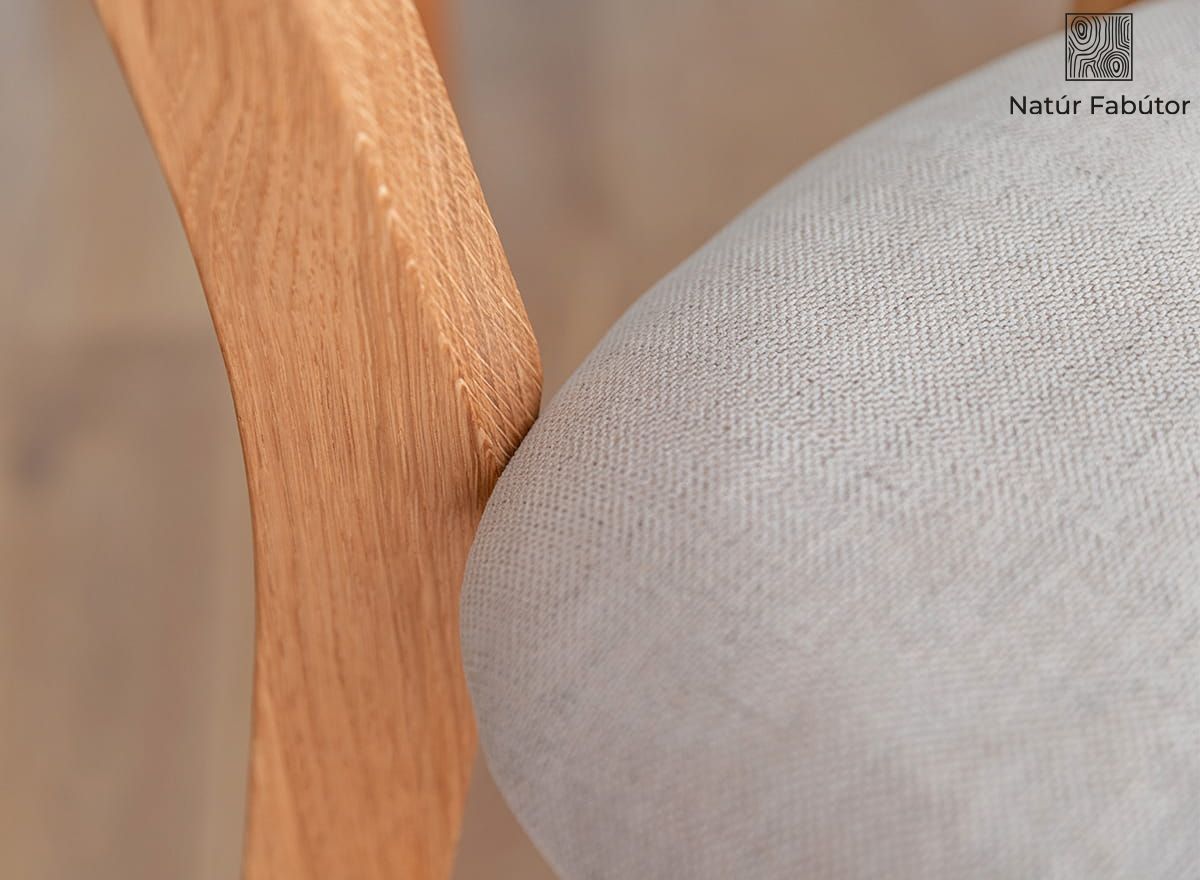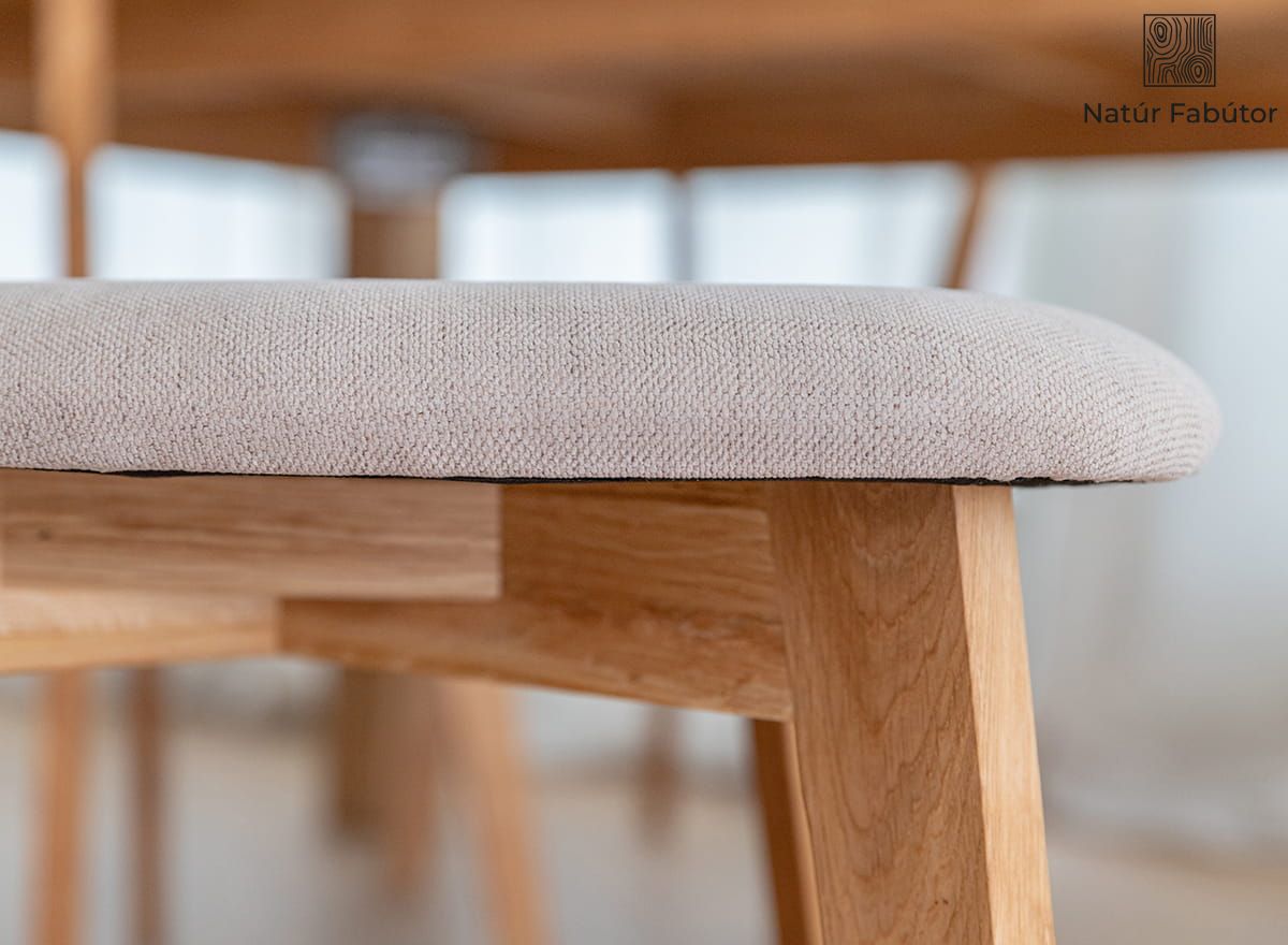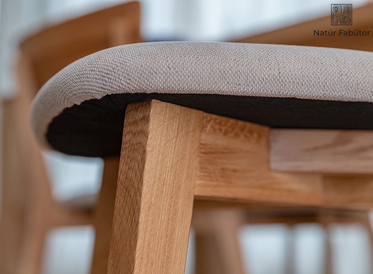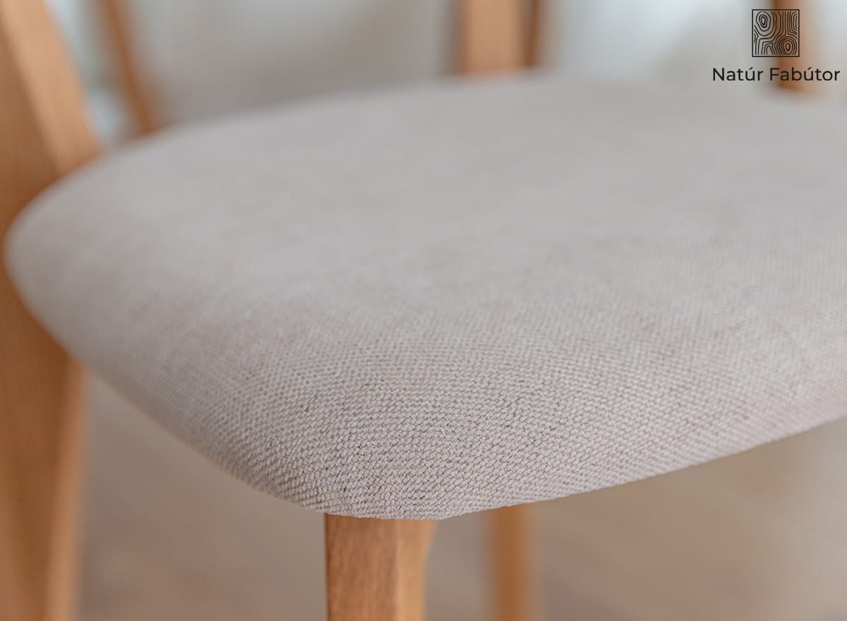 A bemutatott tölgyfa szék kárpitozott üléssel teljes egészében egy modern, kellemes tapintású, 380 g/m² sűrűségű (100% poliészter) anyaggal lett bevonva. A szövet tökéletesen bírja a mindennapos használatot, és a használat intenzitásától függetlenül megőrzi stílusát, valamint ellenáll a kopásnak.
