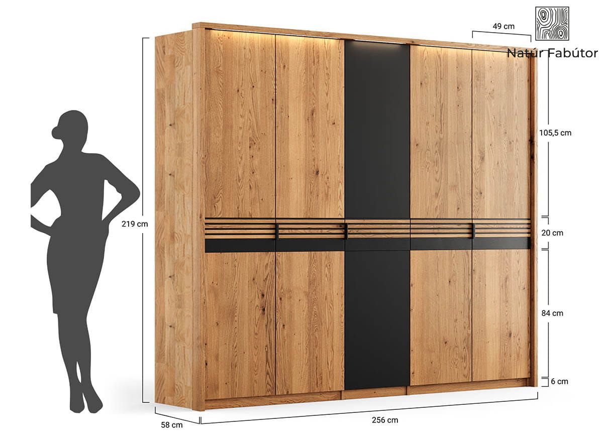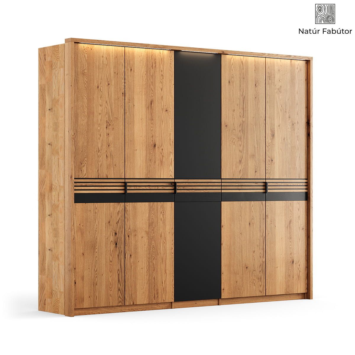 A Ravello kollekció 5D fa ötajtós gardróbszekrénye kiváló lehetőség a természet befogadására a hálószobában és gyakorlatilag teljesen nyers formában. A bútordarab természetes tölgyfából készült, aminek köszönhetően időtálló karakterrel, nemes megjelenéssel rendelkezik, és teljesen egyedi, ami a szabálytalanul eloszló gyűrűkből és csomókból látszik, amit egyedül a természet döntött el. A fekete szín még elegánsabbá teszi - a középső ajtó fekete matt üvegből készült, ráadásul az ajtók közepén fekete díszcsíkok futnak keresztül.