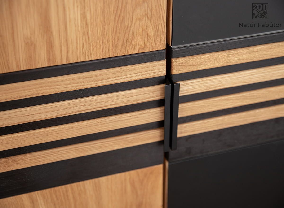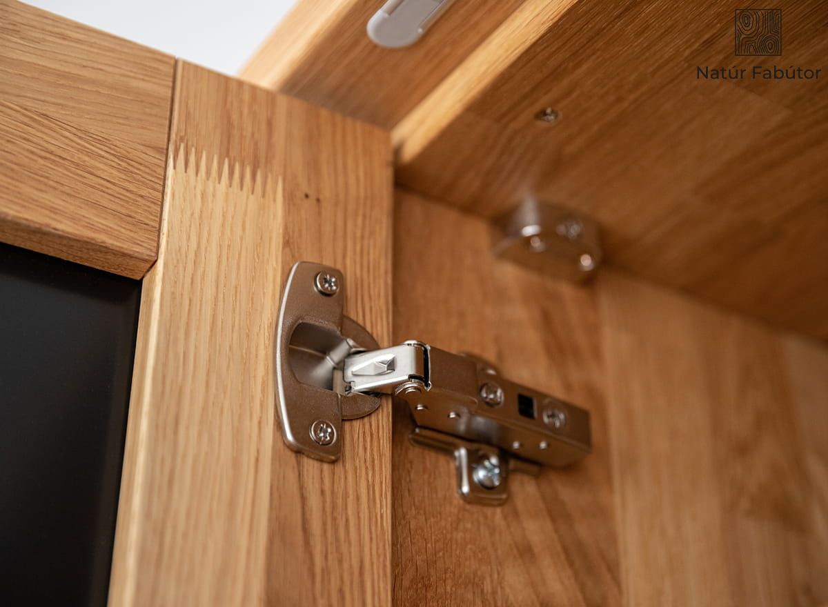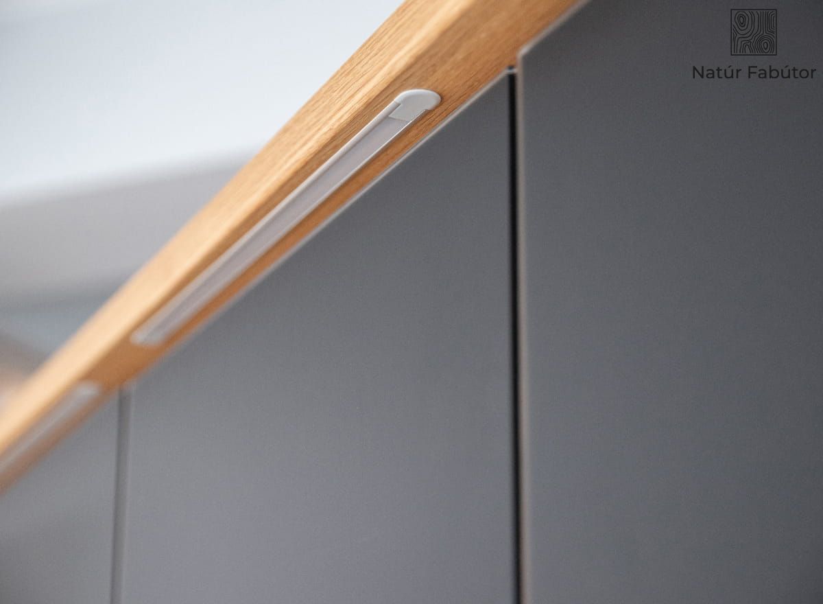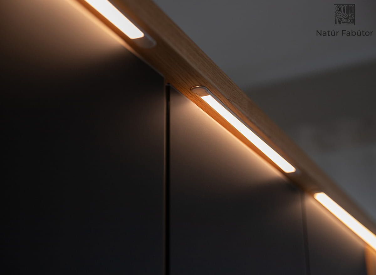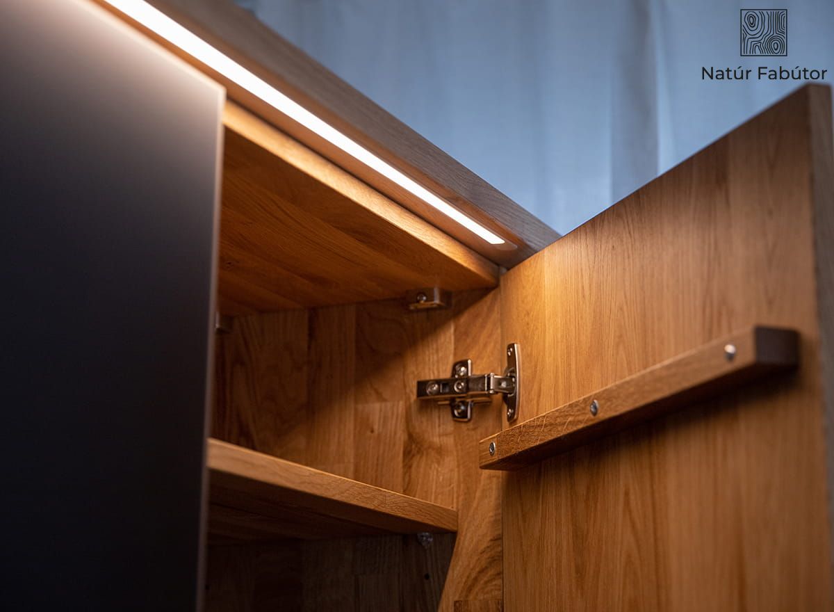 Az elülső részen porszórt fém fogantyúk találhatók, amelyek ellenállnak a kopásnak és a fakulásnak, míg a középső részen teljes magasságban polcnyílások találhatók, amelyek elhelyezési szabadságot biztosítanak - olyan magasságokban helyezi el a polcokat, ahogy az Önnek megfelelő. A frontok zökkenőmentes nyitását a Hettich zsanérok biztosítják, amelyek lágy zárási funkcióval vannak ellátva. A teljes szekrény 2 cm vastag deszkából készült. Szintén figyelemre méltó a háttérvilágítás - erős és csúcskategóriás LED-eket használtunk.