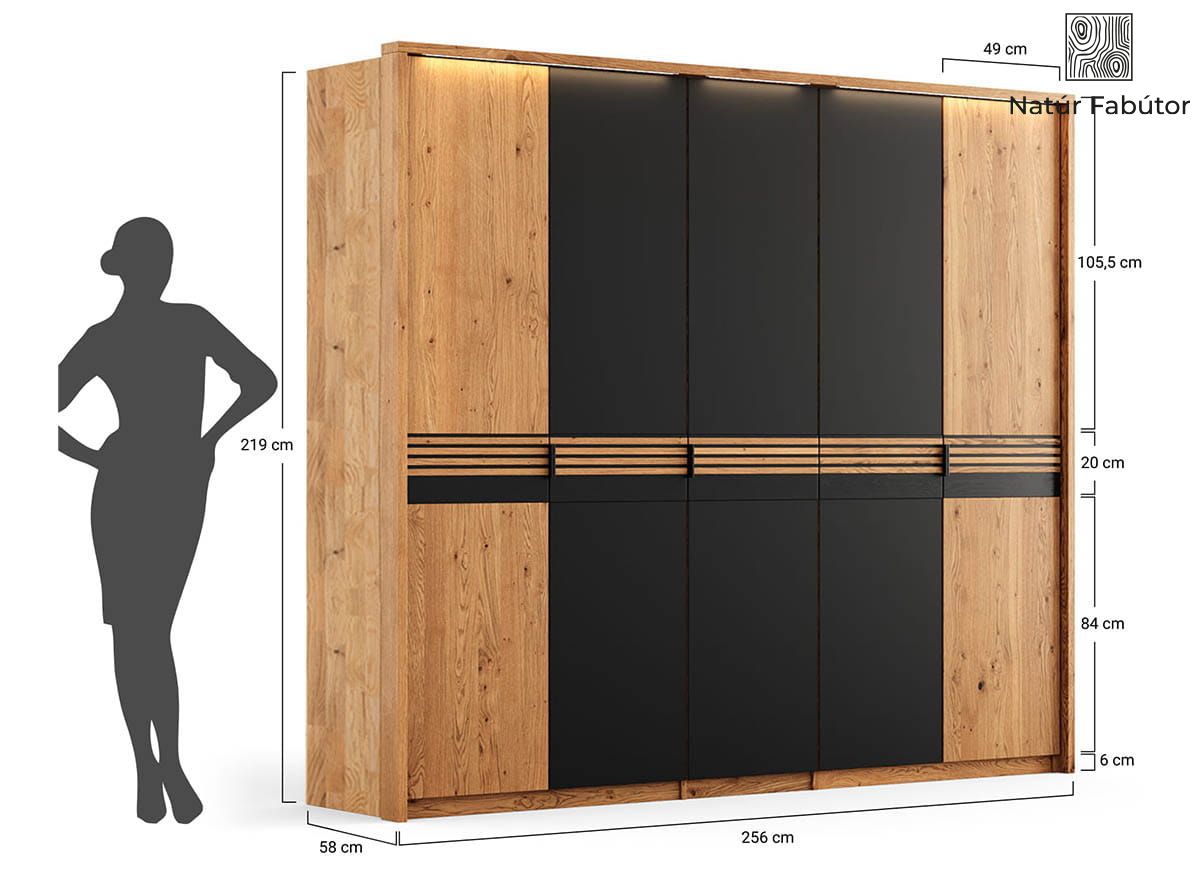 A Ravello kollekció modern, háttérvilágítással ellátott gardróbszekrénye rengeteg tárolóhelyet kínál, amelyet az ajtók mögött talál - 3 ajtó fekete matt üveg, a két szélső ajtó aranyszínű tölgy, melyeken látható a fa természetes erezete. Ez a természetes famintázat kiemeli a darab egyedi jellegét, és biztosítja, hogy az Ön szekrénye egyedi és megismételhetetlen. További dekoratív elemet jelentenek a vízszintesen elhelyezett lécek, amelyek egyszerre díszítik a bútort és az egész teret.