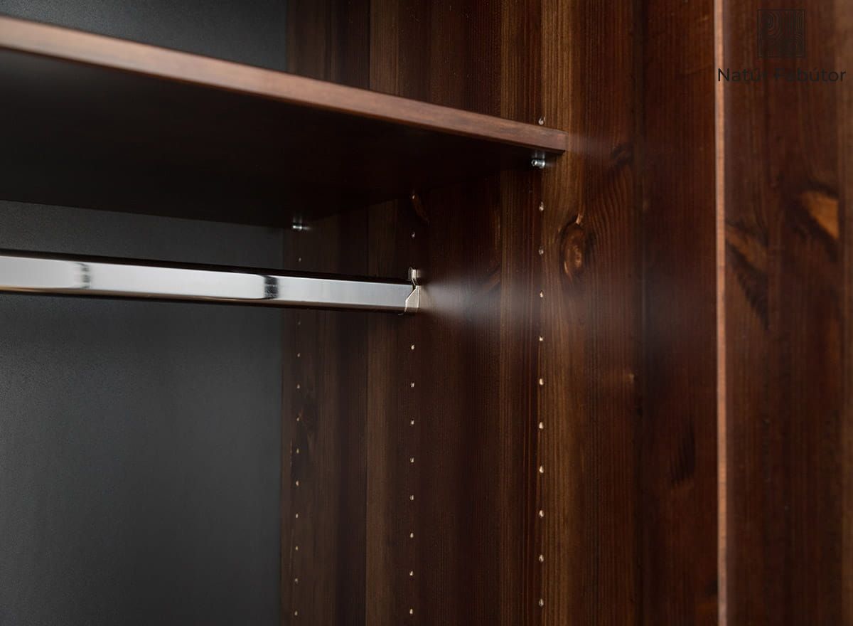 A klasszikus, kétszárnyú ajtók mögött olyan belső tér rejtőzik, amely az Ön kényelmét szolgálja. A tágas belső kialakítás lehetővé teszi a teljes ruhatár tárolását – a könnyű ingektől egészen a télikabátokig – anélkül, hogy zsúfoltság vagy gyűrődés keletkezne a ruhákon. A felső polc ideális hely szezonális kiegészítők, ágynemű vagy ritkábban használt tárgyak számára, míg az alsó rész rugalmas tárolást kínál – legyen szó dobozokról vagy lazán elhelyezett textíliákról. A Rosella fenyő szekrény tökéletes választás hálószobába, gardróbba, de akár az előszobába is, ahol praktikus, ugyanakkor stílusos tárolási megoldásra van szükség. Klasszikus formája és meleg faárnyalata nem uralja a teret, mégis finoman emeli annak esztétikai értékét.
