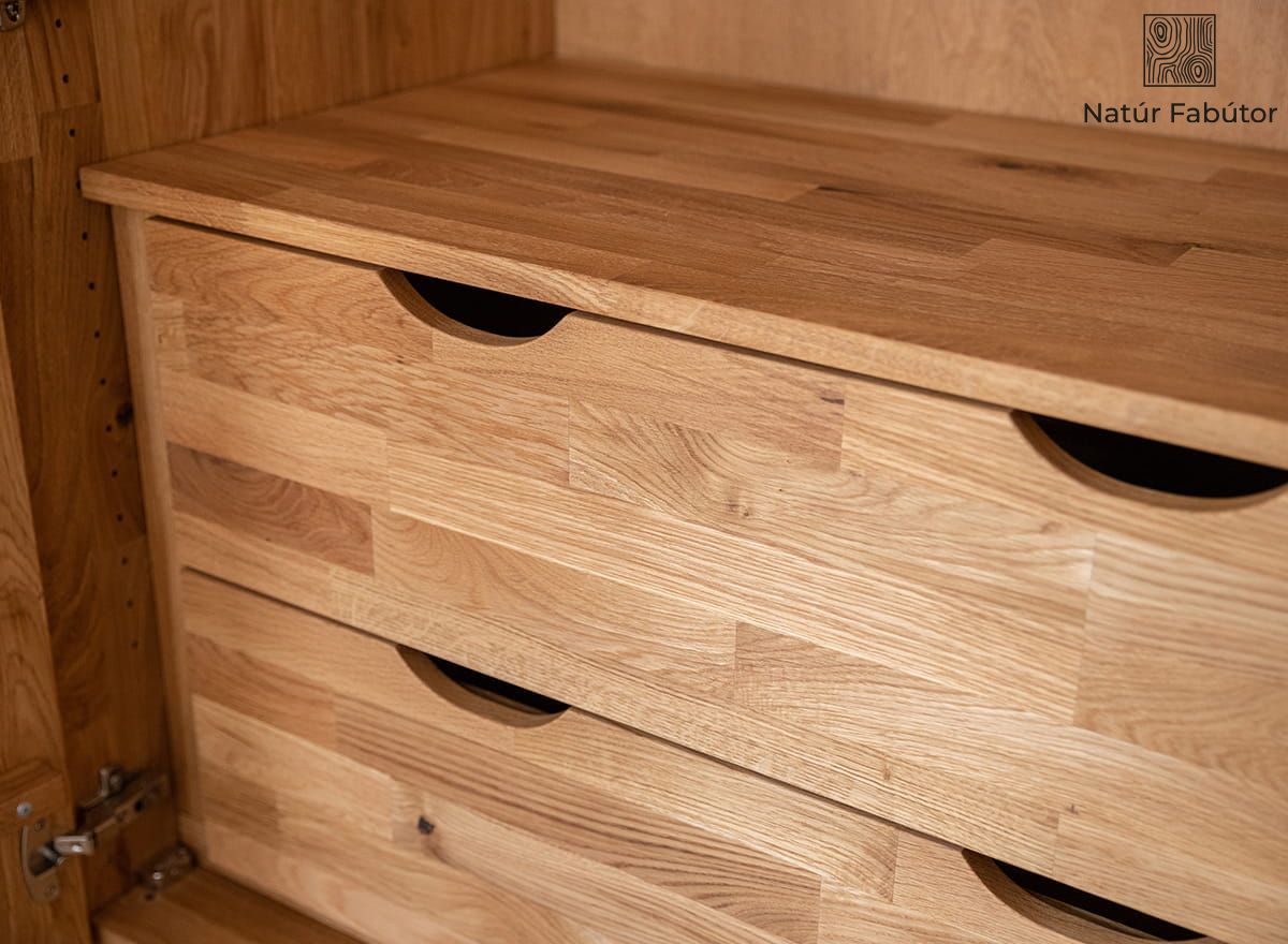 A Ravello 100 cm-es gardróbszekrényhez kínált fából készült modul a teljes szekrényhez hasonlóan a lehető legnagyobb precizitással készült fából - olajozott természetes tölgyfából. A tölgy exkluzív és elegáns anyag, amely azzal is lenyűgöző, hogy minden körülmények között hosszú évekig tartó intenzív használatnak is ellenáll. Maga az olajozás viszont hatékonyan csökkenti a külső felület sérülésének kockázatát és lehetővé teszi a bútorok több évtizedes használat után történő újrafényezését.