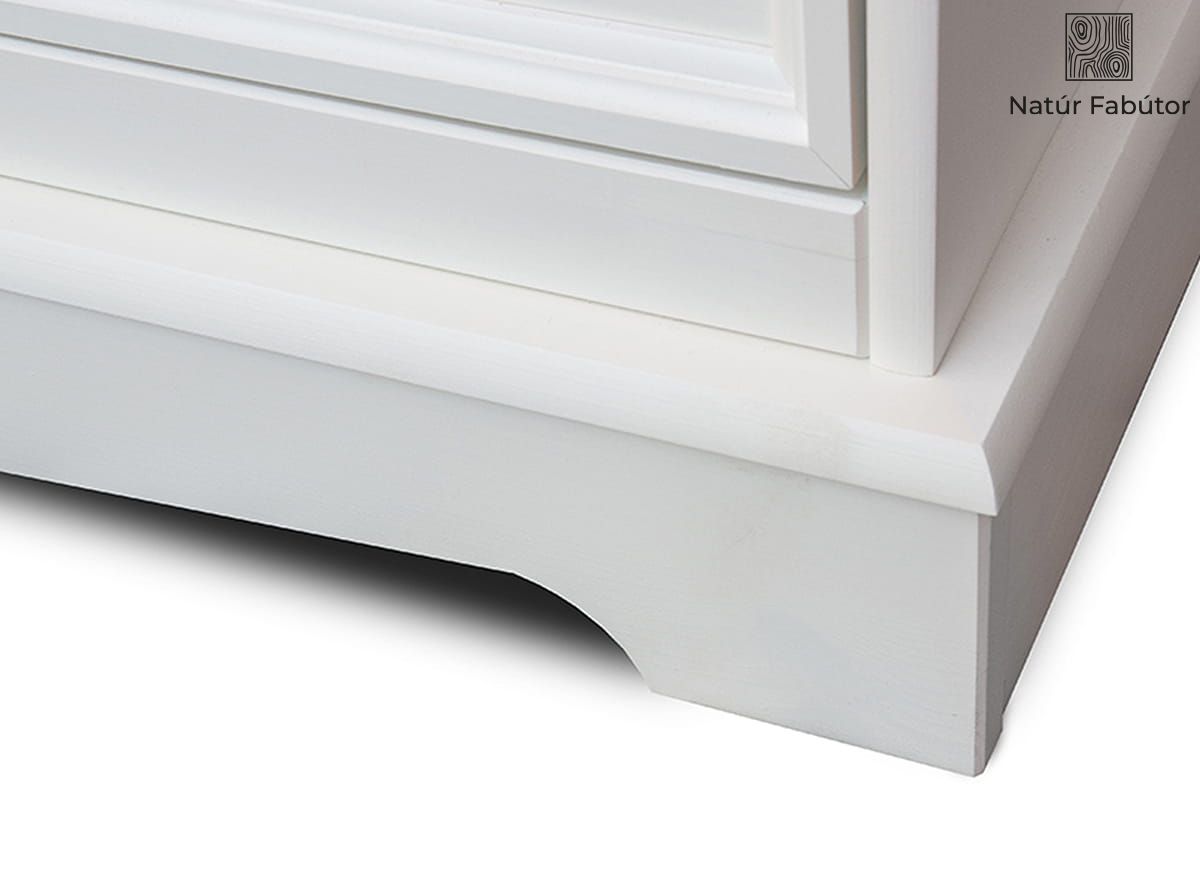 A Belluno Elegante faládát a nemzetközi RAL színskála 9010-es számú, tejfehér, vízbázisú festékével vontuk be. A vízbázisú lazúr körülbelül 85%-os fedést biztosít. Ennek köszönhetően a bútor felületén a fa természetes struktúrája, erezete és göcsei (elhalt ágmaradvány) rajzolódnak ki. Az egyedi mintázatnak köszönhetően minden egyes bútordarab különleges, megismételhetetlen példány. A láda fedelét tölgy színű, vízbázisú festékkel festettük le. Az első ránézésre ellentmondásos színhasználat – fehér és tölgy – a valóságban egyedülálló kompozíciót alkot egymással.