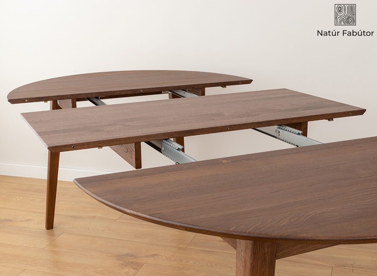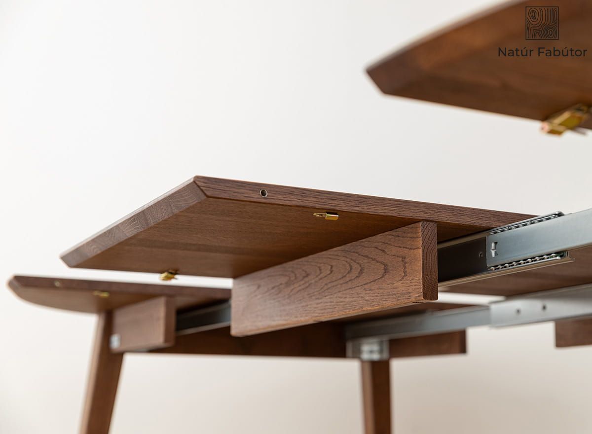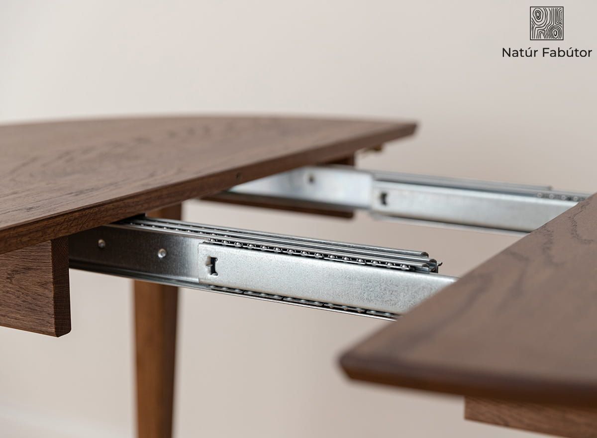 A tölgyfa hosszú távú választás – rendkívül tartós, ellenáll a használat nyomainak, és gyönyörűen érlelődik az idő múlásával. Az olajozott felület nemcsak kiemeli a fa természetes erezetét, hanem védi is az asztallapot a nedvességtől és a mindennapi használattól. A stabil szerkezetnek köszönhetően elfelejtheti a billegést vagy az egyenetlenségeket – ez egy masszív bútor, amely minden kihívásnak megfelel. A kihúzható mechanizmus könnyed, intuitív és problémamentes – simán működik, erőfeszítés nélkül.