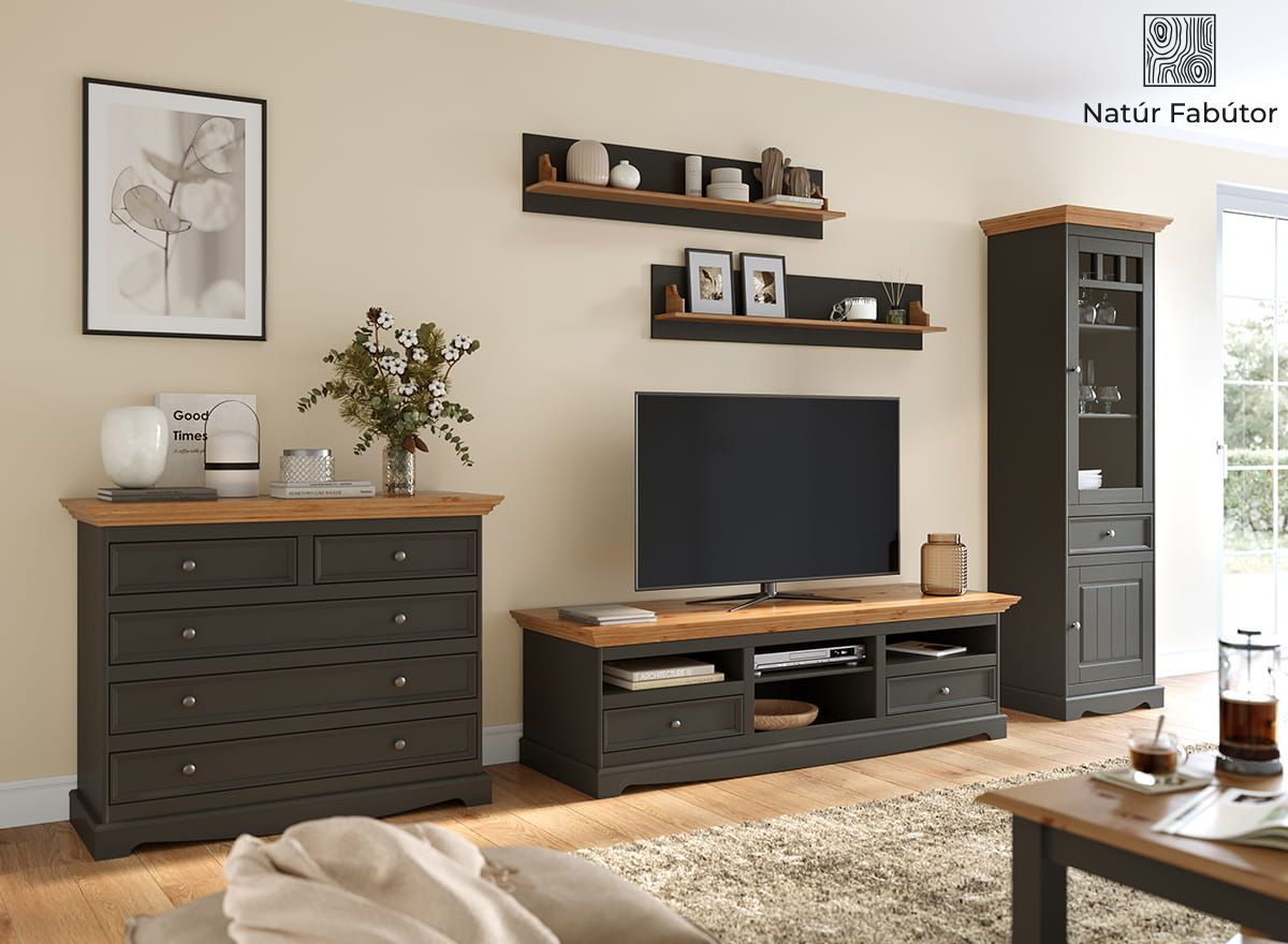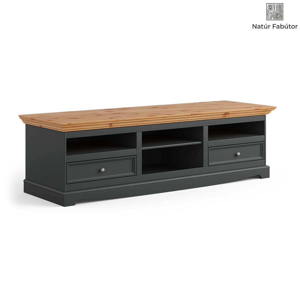 A szekrény sötét színe az aranyszínű tetővel szembeállítva egyaránt illik a provence-i és a loft enteriőrökhöz. A grafit színű szekrényt 90%-os fedést adó, vízbázisú festékbevonattal láttuk el. Ez lehetővé teszi a fa természetes erezetének láthatóségét. A szekrény teteje is természetes fenyőből készült. A provence-i TV-szekrény tetejét páccal és átlátszó lakkozással vontuk be, ami kiemeli a szabálytalan, élvezetes erezetet.