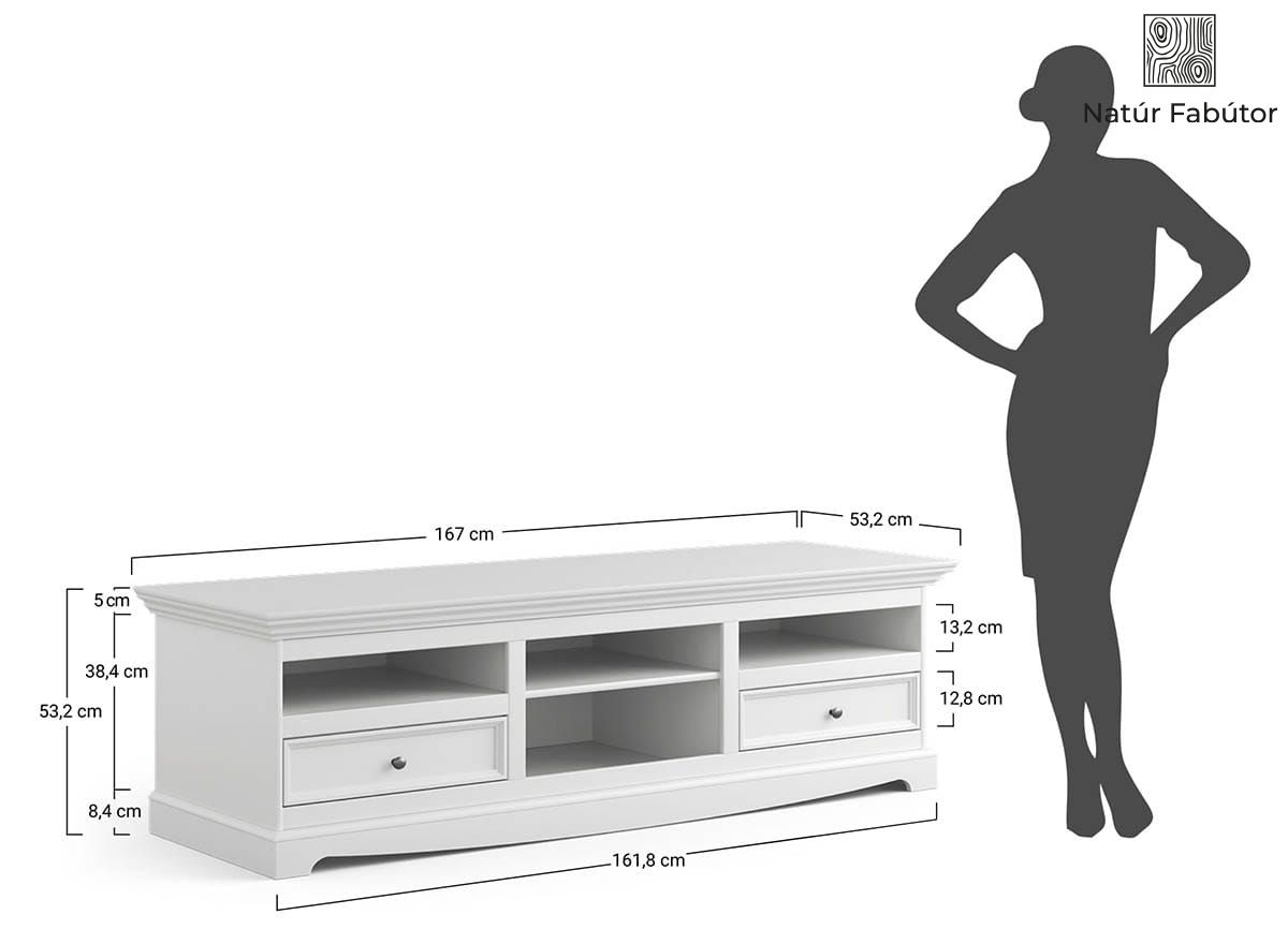 Multimédiás sarkot rendez be otthonában? Nem hiányozhat belőle egy fiókos TV-szekrény, amely a kábelek, töltők és a távirányító elemkészletének tárolására szolgál. A használat kényelmének növelése érdekében a fiókok hangtalanul záródó sínekre vannak állítva. Négy nyitott hely is van a konzol, modem, a zene- vagy DVD-filmgyűjtemény elhelyezésére. A fából készült TV-szekrény széles fedőlapja ideális könyvek, fényképek és dekorációk elhelyezésére.