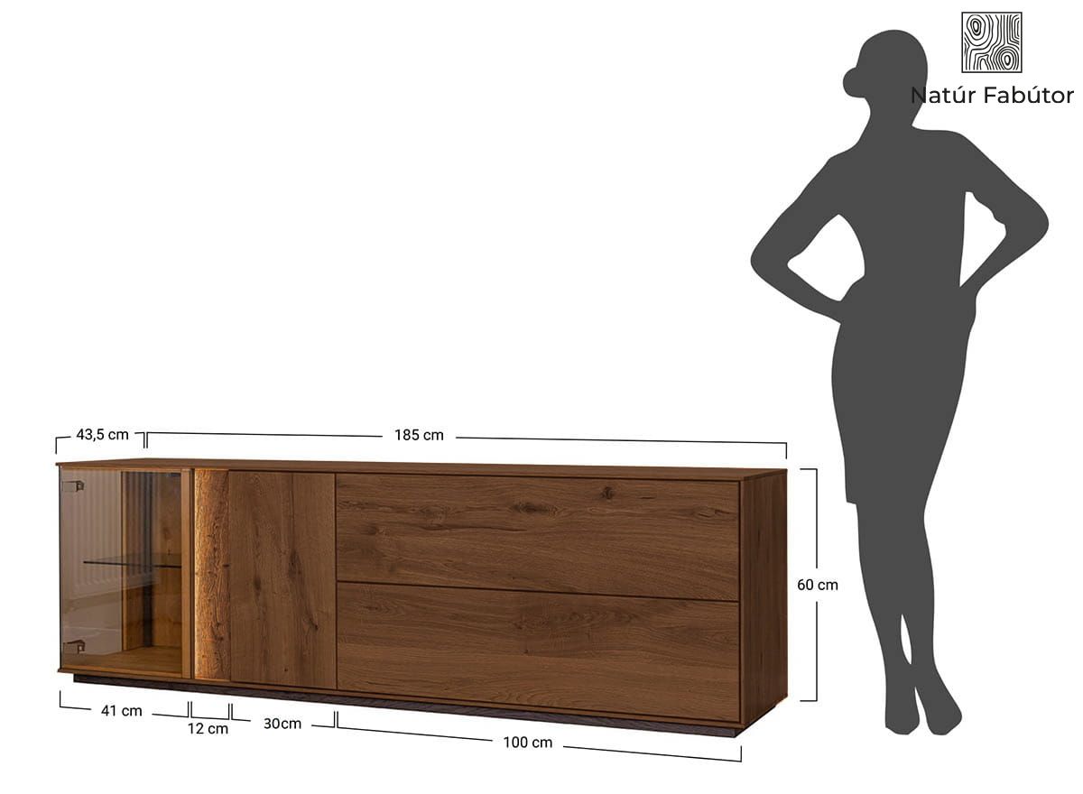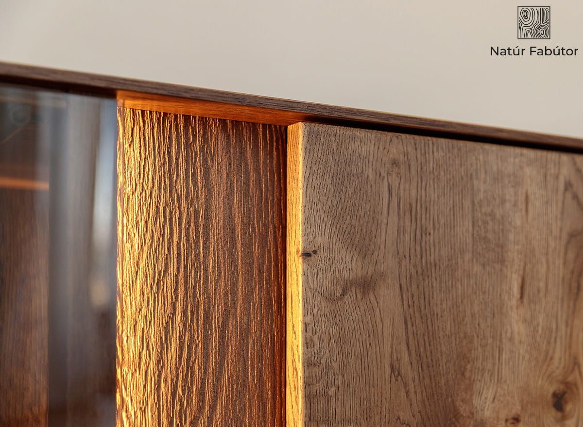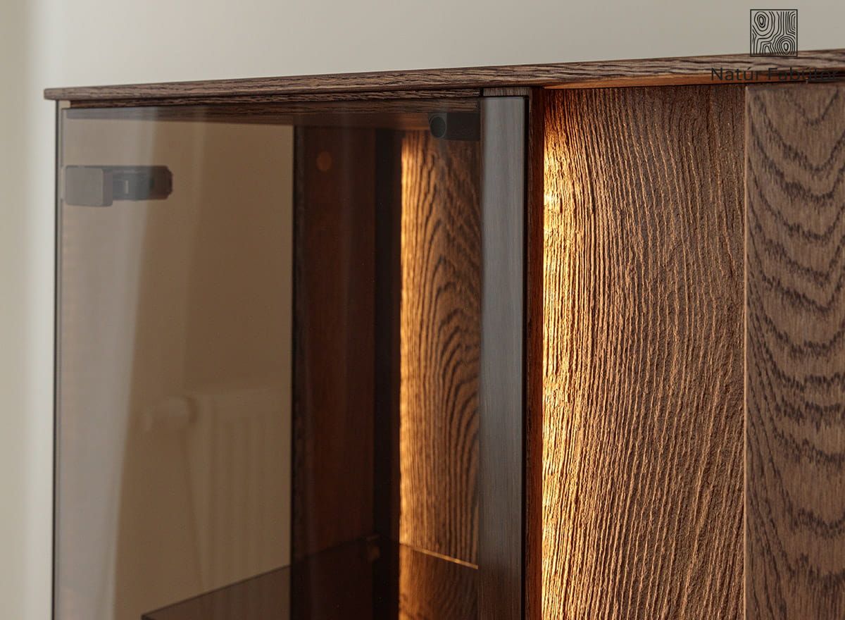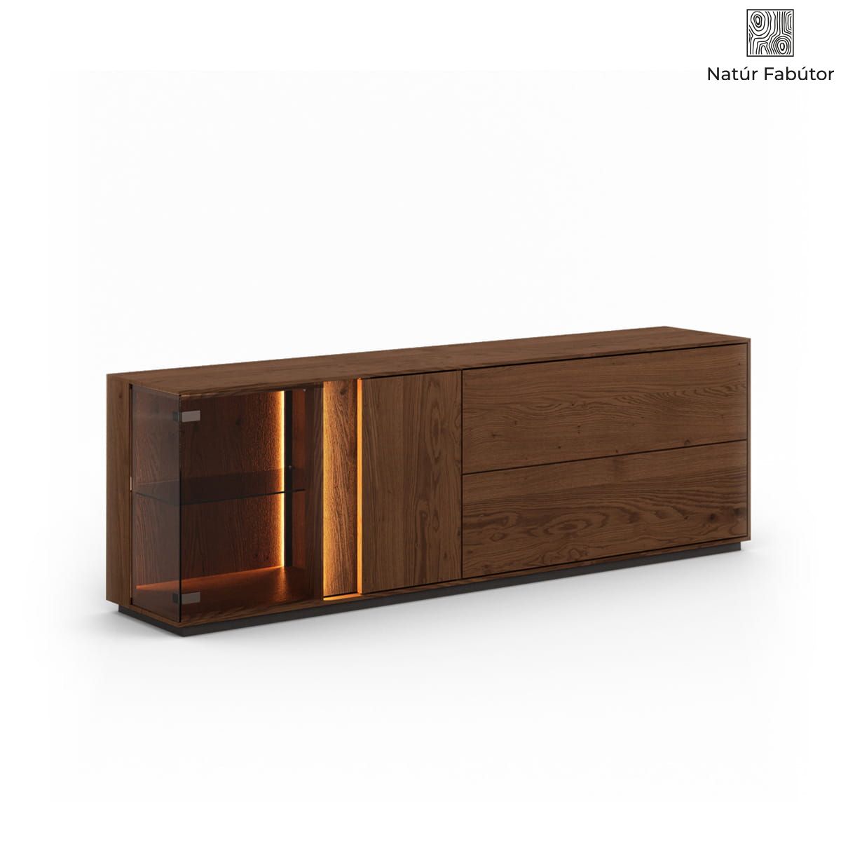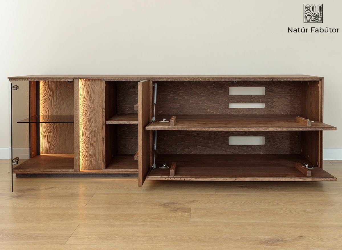 Tölgyfa TV-állvány üvegezett résszel és LED világítással, tabacco színben – Collodi – mesteri kivitelezés és időtálló design