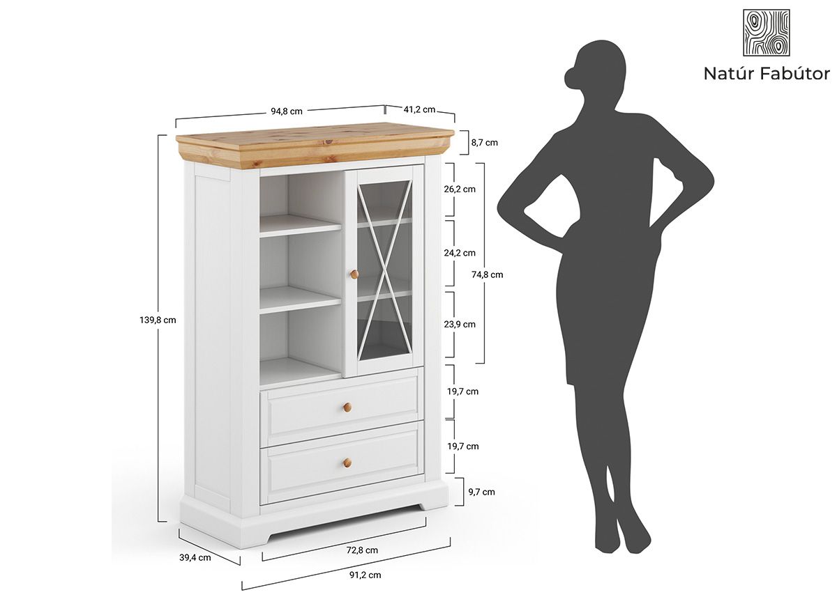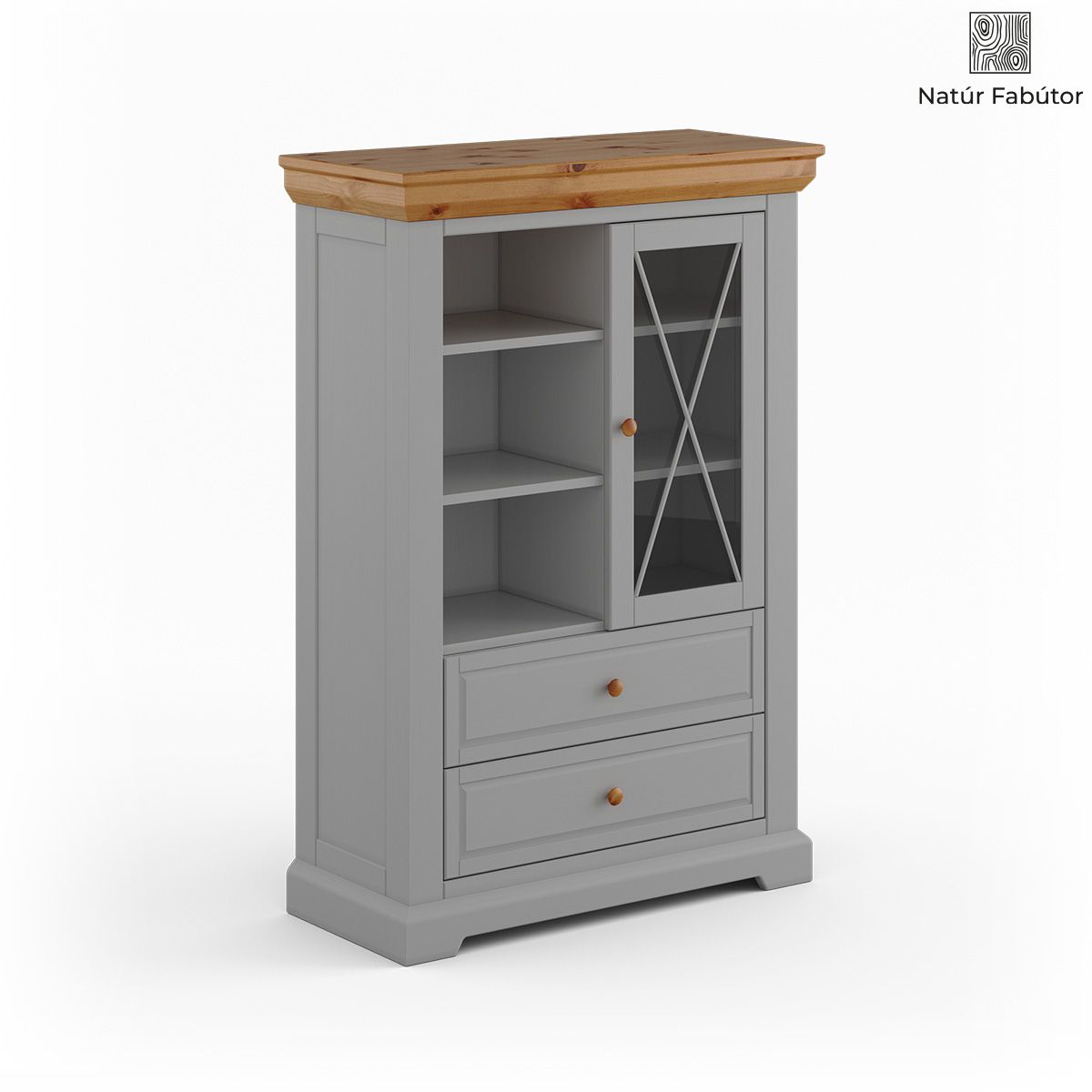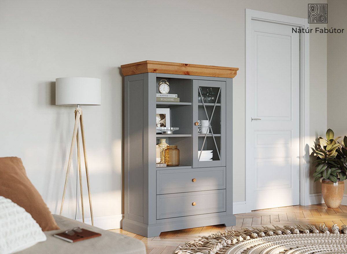 Nem kedveli a sablonos, katalógusból ismerős bútorokat, de értékeli a klasszikus stílust egy csipetnyi modernséggel? A Marone Elite kollekció fenyő vitrinszekrénye pontosan ilyen! A visszafogott hamuszürke árnyalat elegáns és egyedi, az osztólécek finoman díszítik a bútort, míg a tölgy tónusú, meleg árnyalatú fenyő fedlap kellemesen ellensúlyozza a hűvösebb színt. Ennek köszönhetően a bútor tökéletesen illeszkedik provence-i, skandináv vagy klasszikus stílusú enteriőrökbe is. Kiváló választás nappaliba, étkezőbe vagy otthoni irodába – bárhová is helyezi, harmonikus és látványos eleme lesz a térnek.