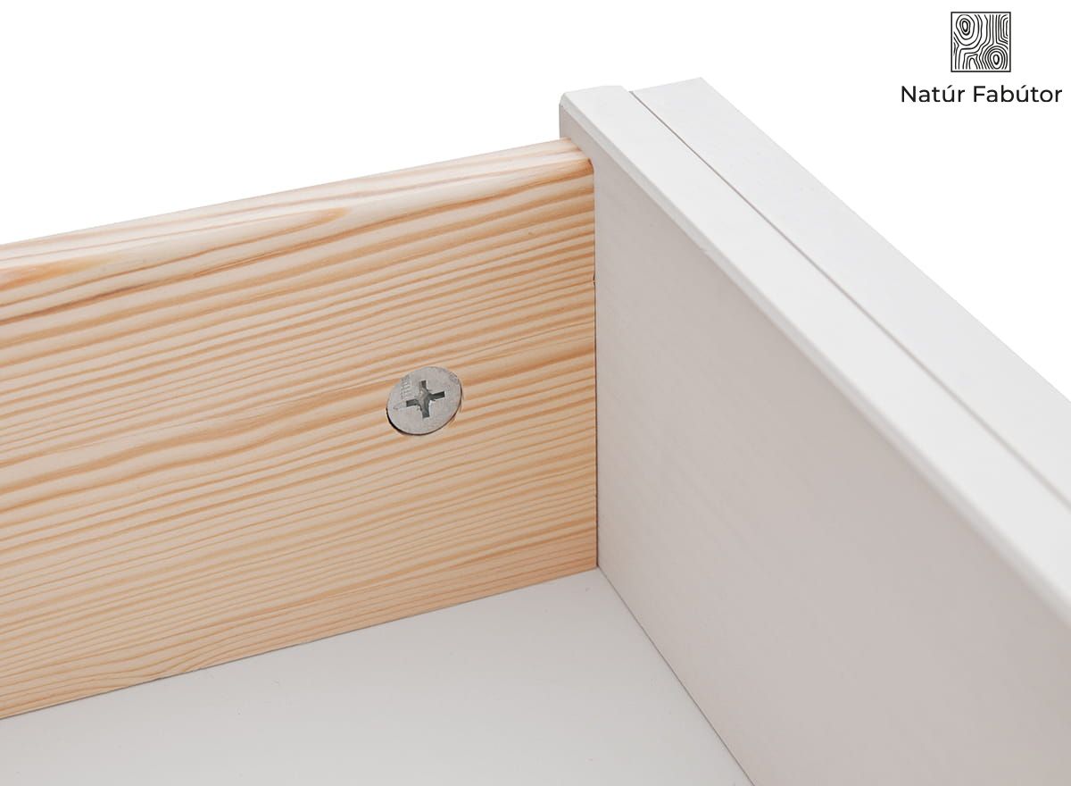 A fából készült bútorok kiválasztásakor figyelembe kell venni az anyag természetes öregedési folyamatait. A bútorokat 85%-os UV-fixálással rendelkező, környezetbarát, vízbázisú festékkel festettük le. A bútorokat belülről fehérre festettük egy rétegen, így az erezet és a csomók jobban láthatóak, mint a termék külsején. Idővel a csomók intenzívebb színt vehetnek fel, ami a fa természetes öregedési folyamata. A fából készült bútorok karbantartásakor érdemes ügyelni arra, hogy ne használjunk durva rongyokat vagy konyhai tisztítószereket erre a célra - ezek károsíthatják vagy elszínezhetik a felületet. A legjobb, ha nedves, puha rongyot használ. Nem ajánlott a bútorokat közvetlen UV-sugárzásnak kitenni, vagy fűtőberendezések közelében elhelyezni.