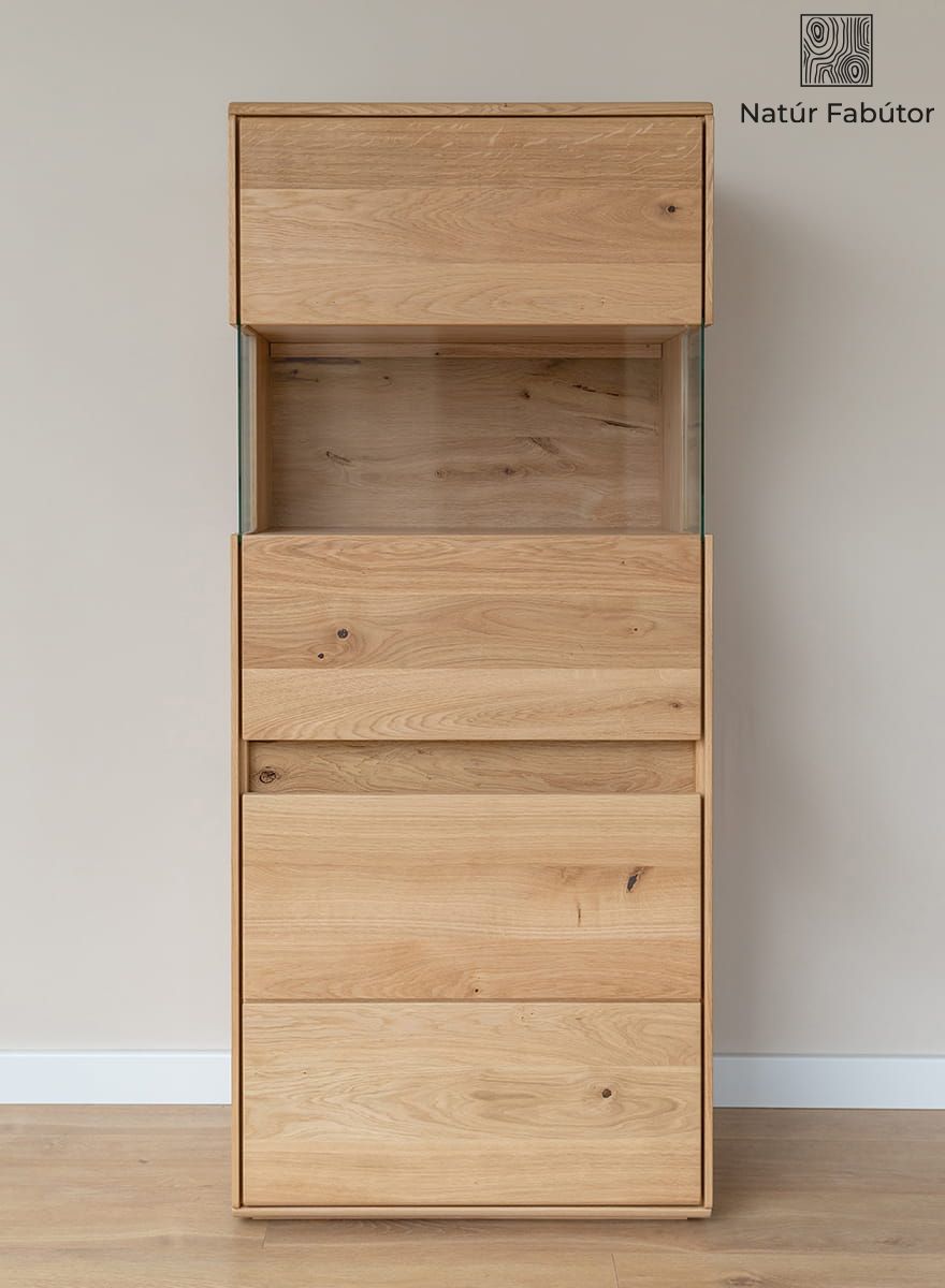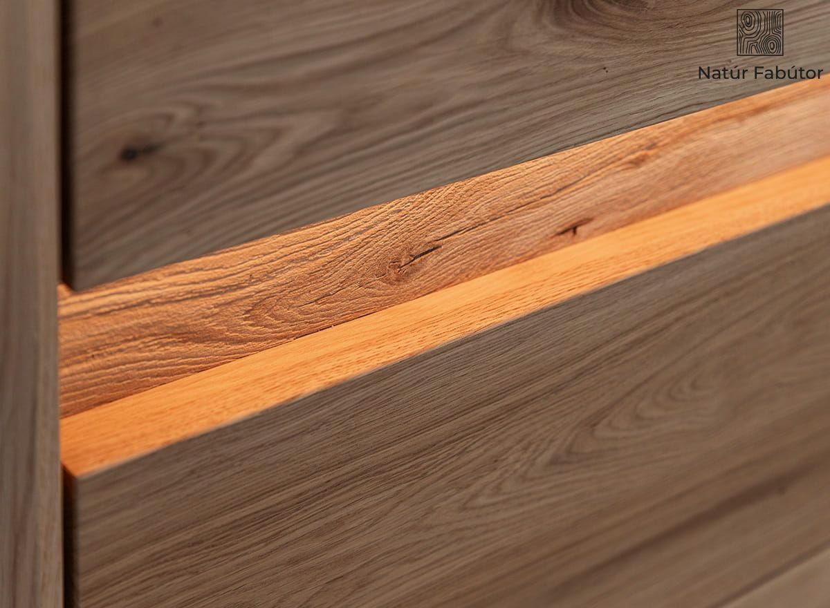 A fabútor a minőség, a tartósság és a szilárdság garanciája, annál is inkább, ha természetes tölgyet, vagyis az egyik legkeményebb fajtát használták a gyártáshoz. A technikai kérdéseken kívül ez egy gyönyörű anyag is, amelyet a felületén végigfutó erezetek és gyűrűk díszítenek. Ahelyett, hogy elfedné, érdemes kiemelni őket. A tölgyfa szekrényt olajozással kezeltük, ami aranyszínűvé tette és kiemelte a fa természetes mintázatát.