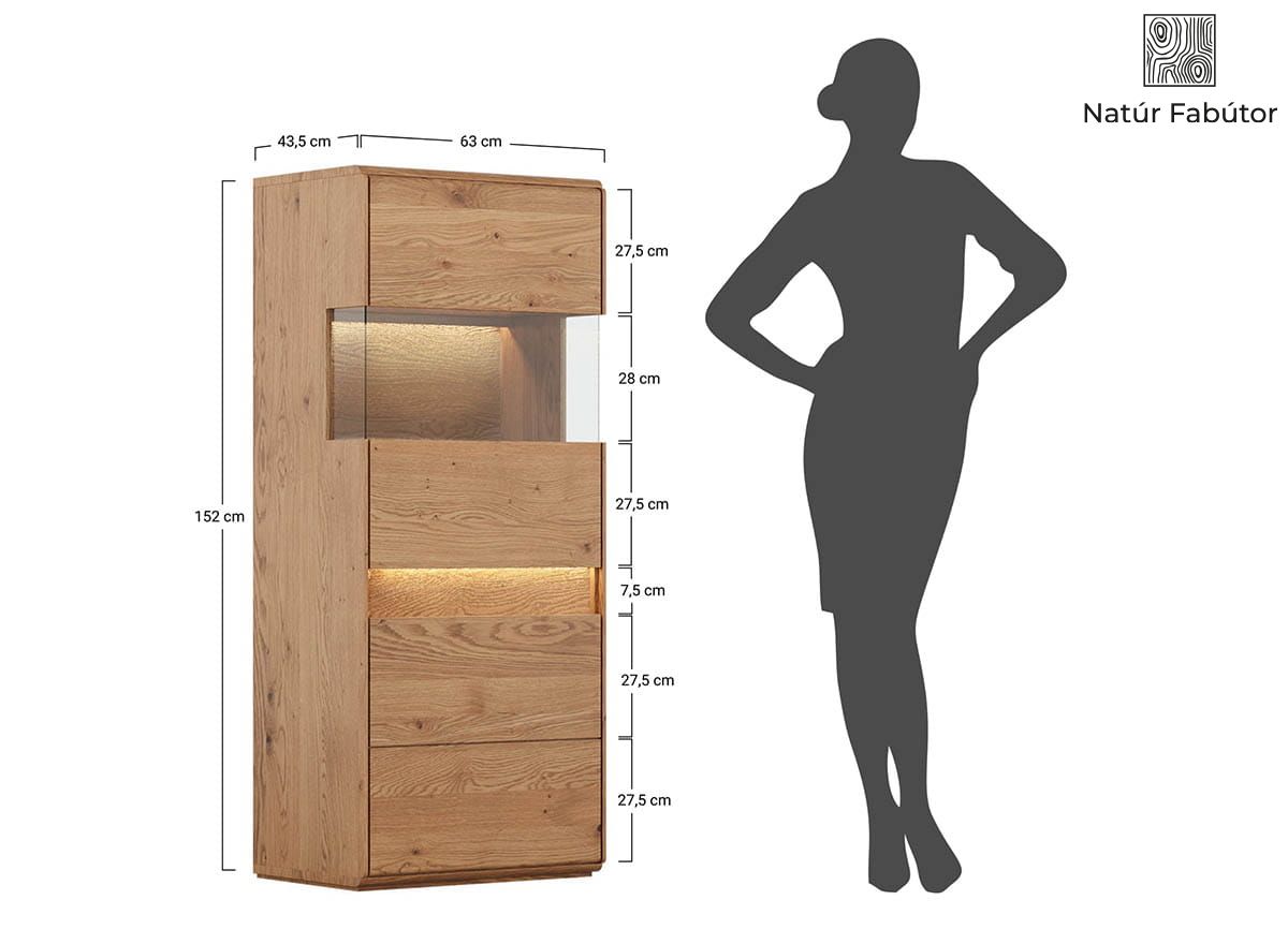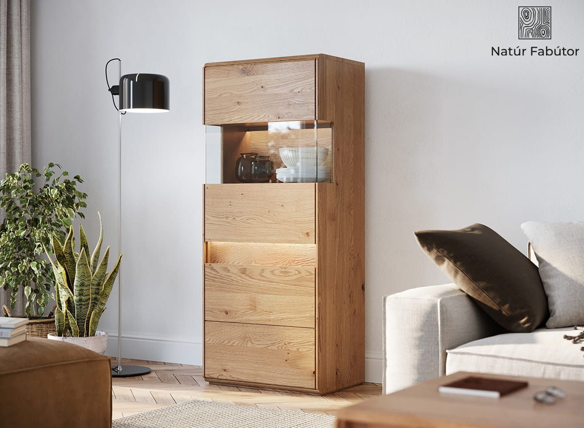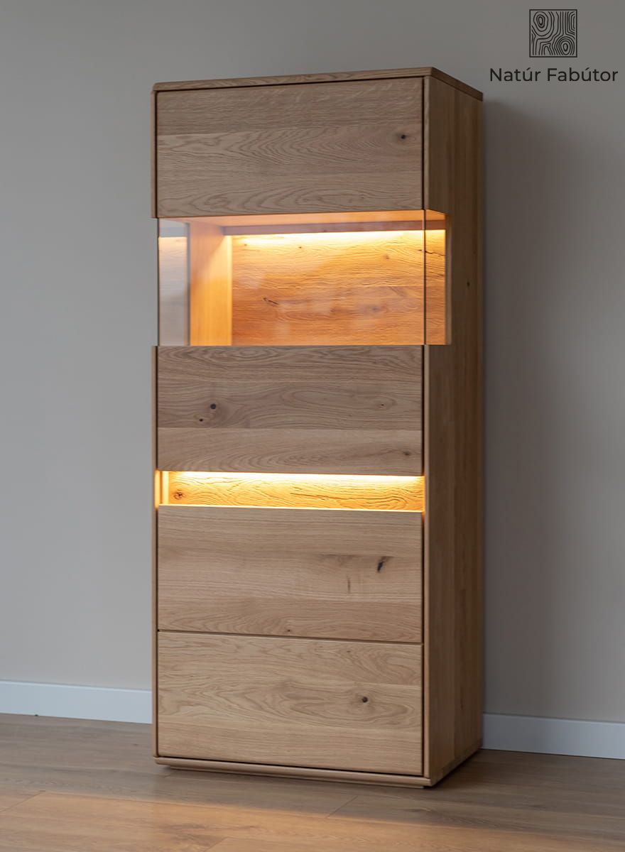 A fából készült szekrényt nagy tartóssága és vitathatatlan stílusa mellett aranyszínű színe, valamint látható szemcsék és csomók jellemzik. Mindezekért a vizuális tulajdonságokért az olajozási folyamat felelős, amellyel a bútorok kezelve lettek. Az egyik deszka érzékelhető fa textúrája viszont a kefélési módszer eredménye. És ez még nem minden! A fából készült szekrényhez tartozik még a vitrin belső világítása és az ajtók lágy záródása, ami még kényelmesebbé teszi használatát.