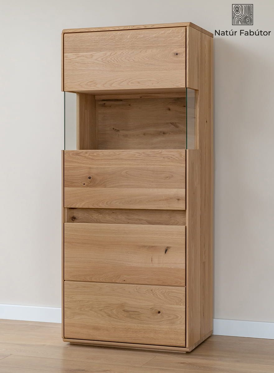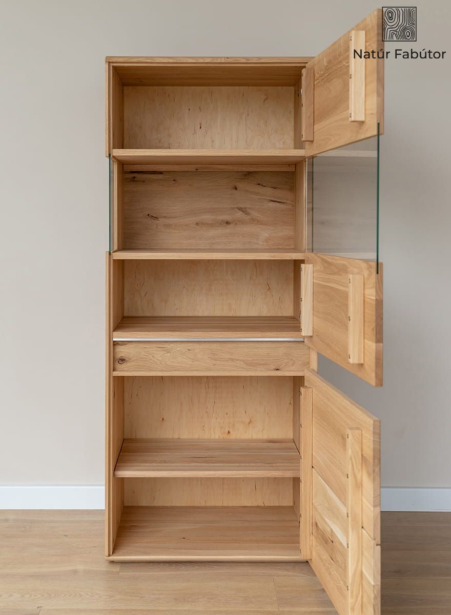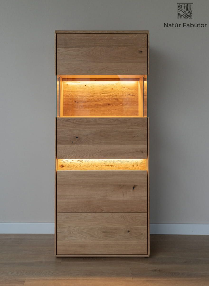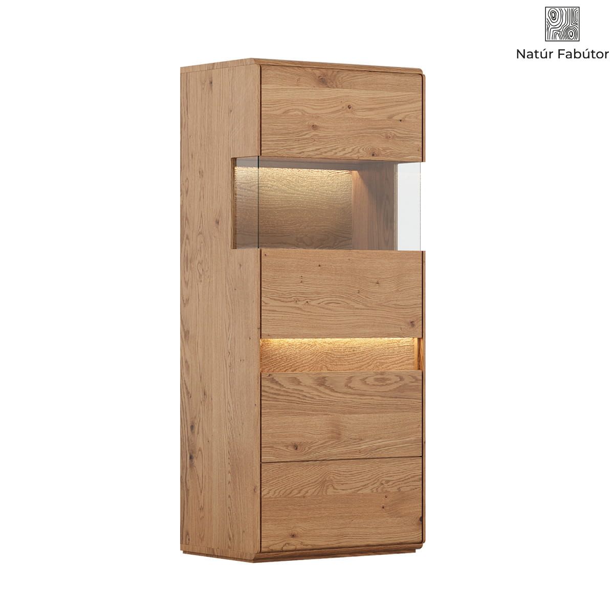 A fából készült szekrényt nagy tartóssága és vitathatatlan stílusa mellett aranyszínű színe, valamint látható szemcsék és csomók jellemzik. Mindezekért a vizuális tulajdonságokért az olajozási folyamat felelős, amellyel a bútorok kezelve lettek. Az egyik deszka érzékelhető fa textúrája viszont a kefélési módszer eredménye. És ez még nem minden! A fából készült szekrényhez tartozik még a vitrin belső világítása és az ajtók lágy záródása, ami még kényelmesebbé teszi használatát.