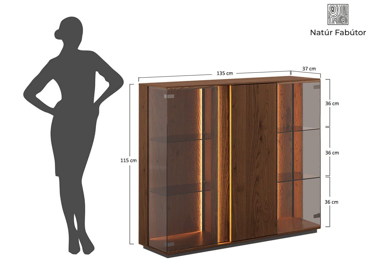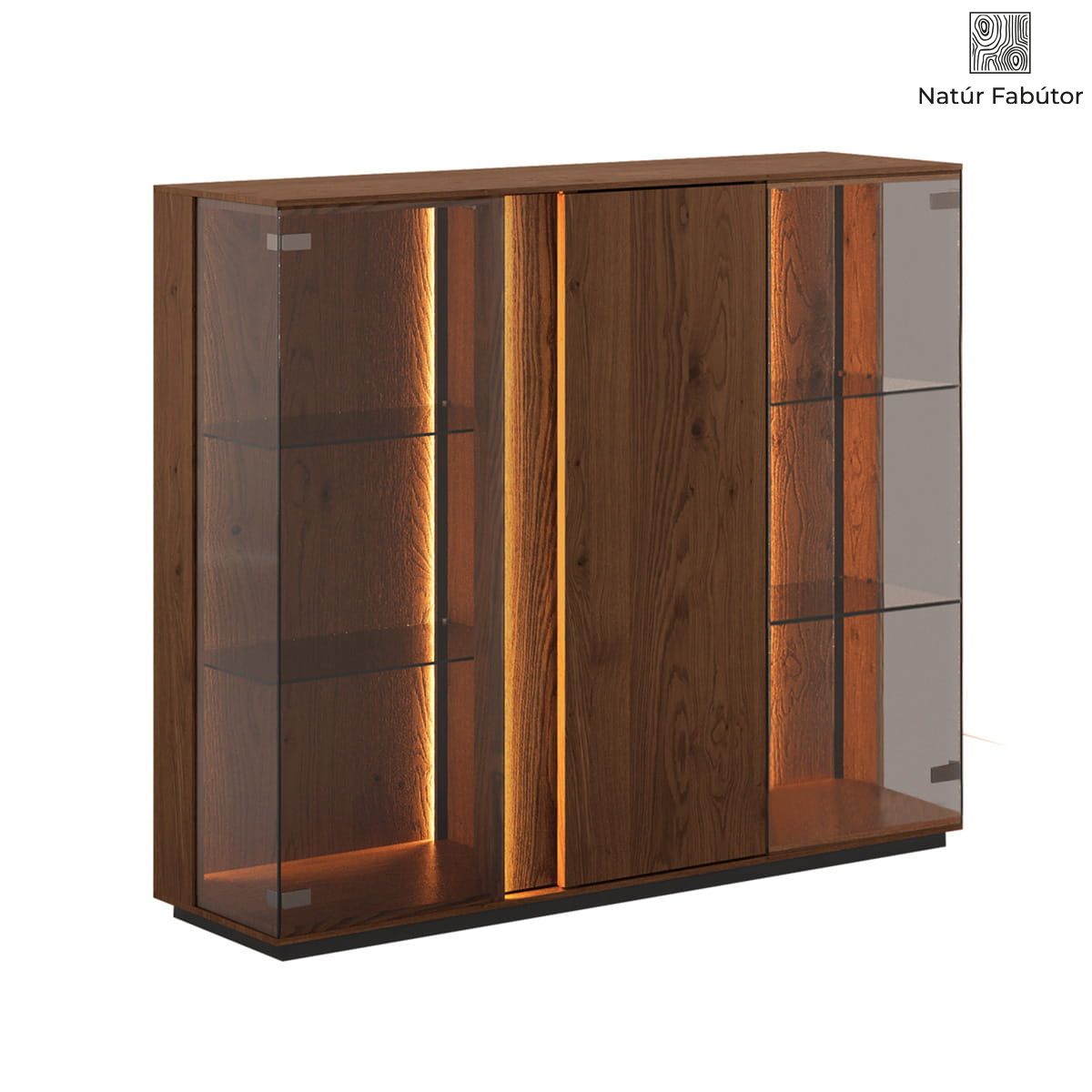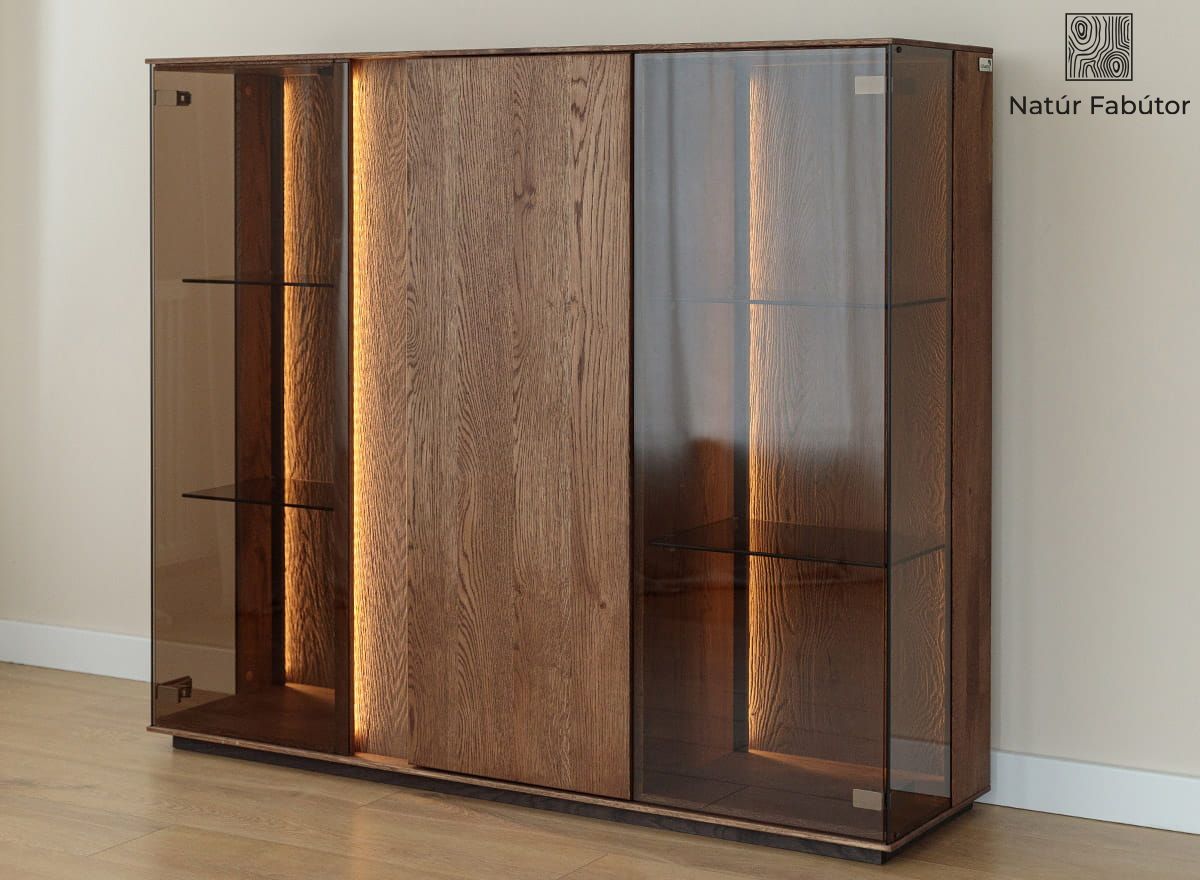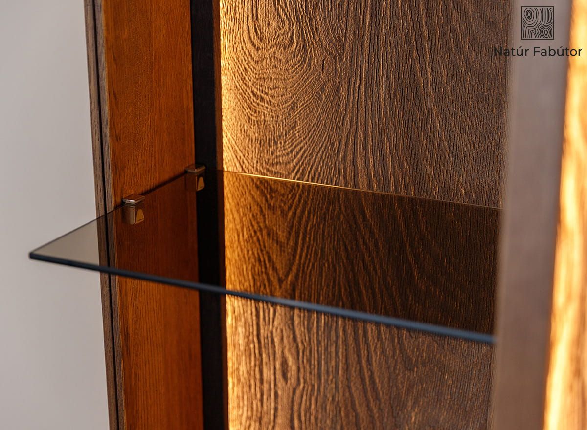 Üveges tölgyfa vitrin LED világítással, tabacco színben – Collodi – masszív fa és üveg harmonikus formában