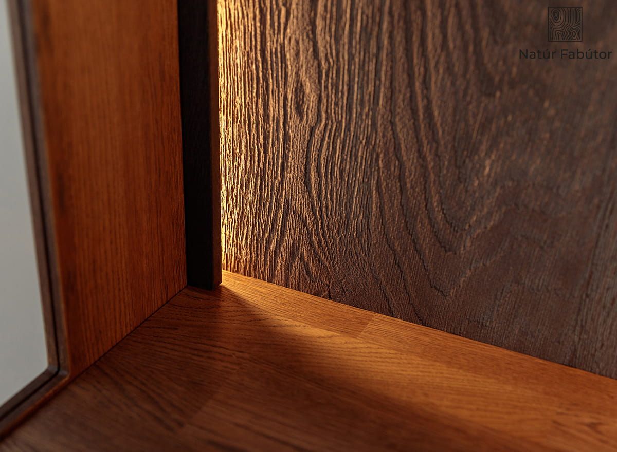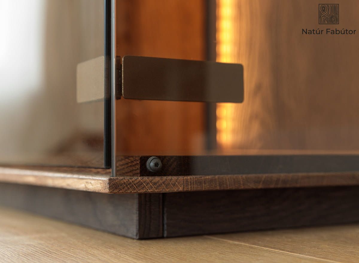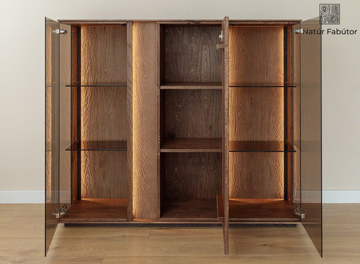 A masszivitás és a kivitelezés minősége minden részletben tetten érhető. A vad tölgy, természetes olajjal kezelve, gond nélkül ellenáll a mindennapos használatnak anélkül, hogy nyomot hagyna rajta az idő. Az ajtók egy enyhe nyomásra nyílnak a tip-on rendszer révén – fogantyúk és felesleges kiegészítők nélkül. A vitrin stabilan áll, így biztonságot nyújt a benne tárolt tárgyak számára.